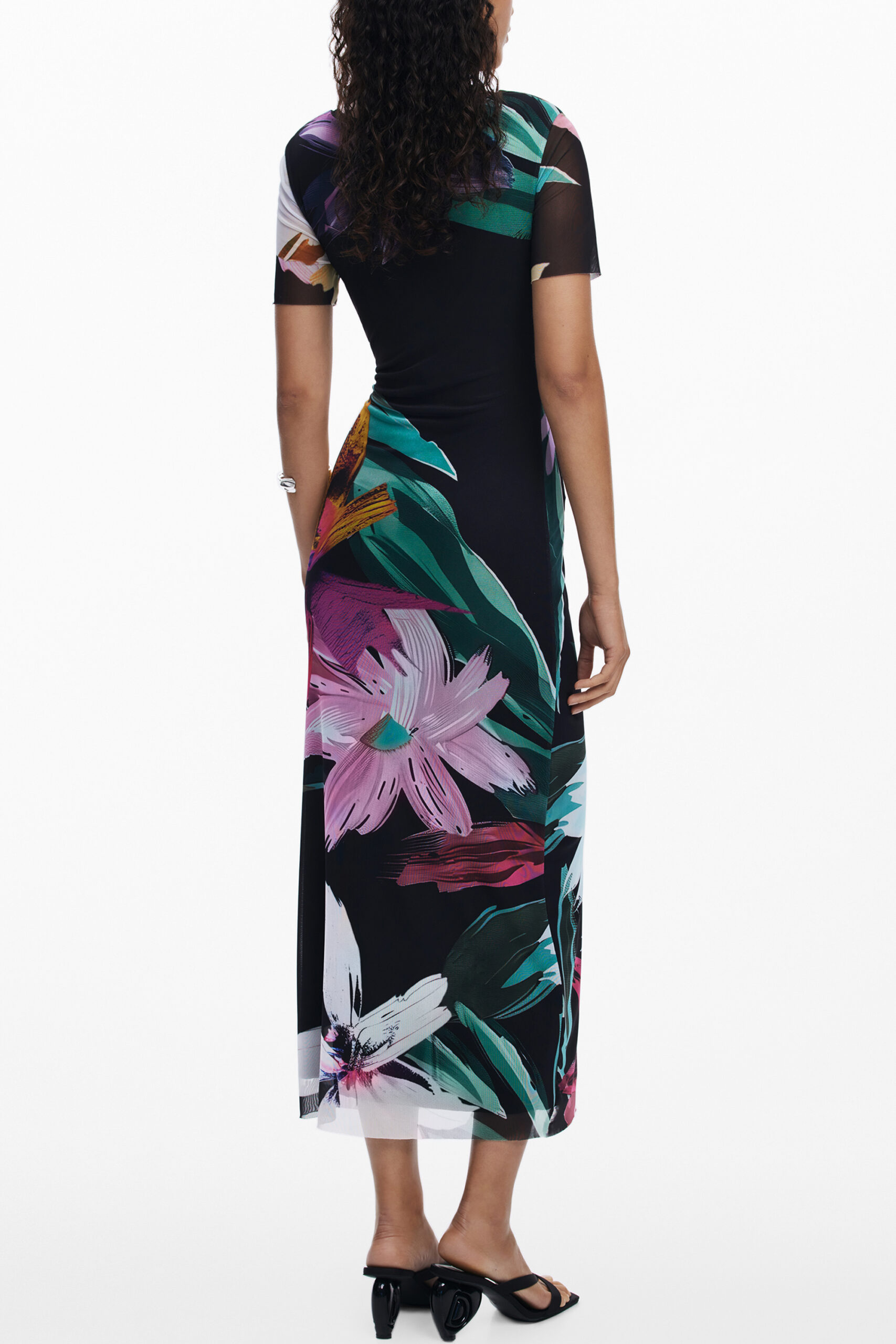 LONG PATTERNED DRESS, SHORT SLEEVES, BERNADETTE, CREW NECK, LOGO