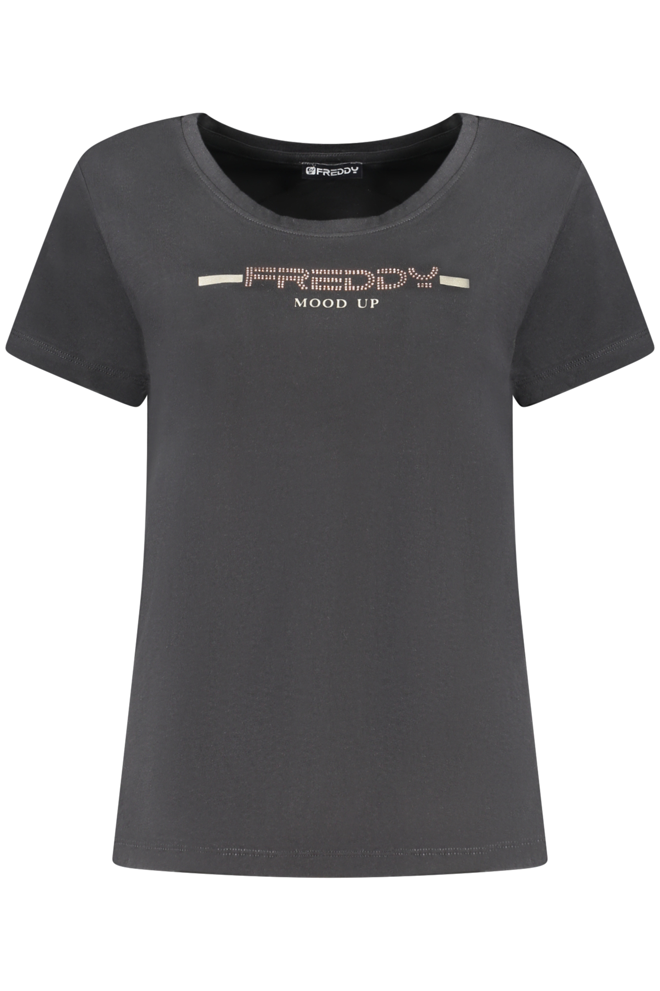 SHORT-SLEEVED T-SHIRT, WIDE NECKLINE, RHINESTONE APPLICATION, PRINT, LOGO