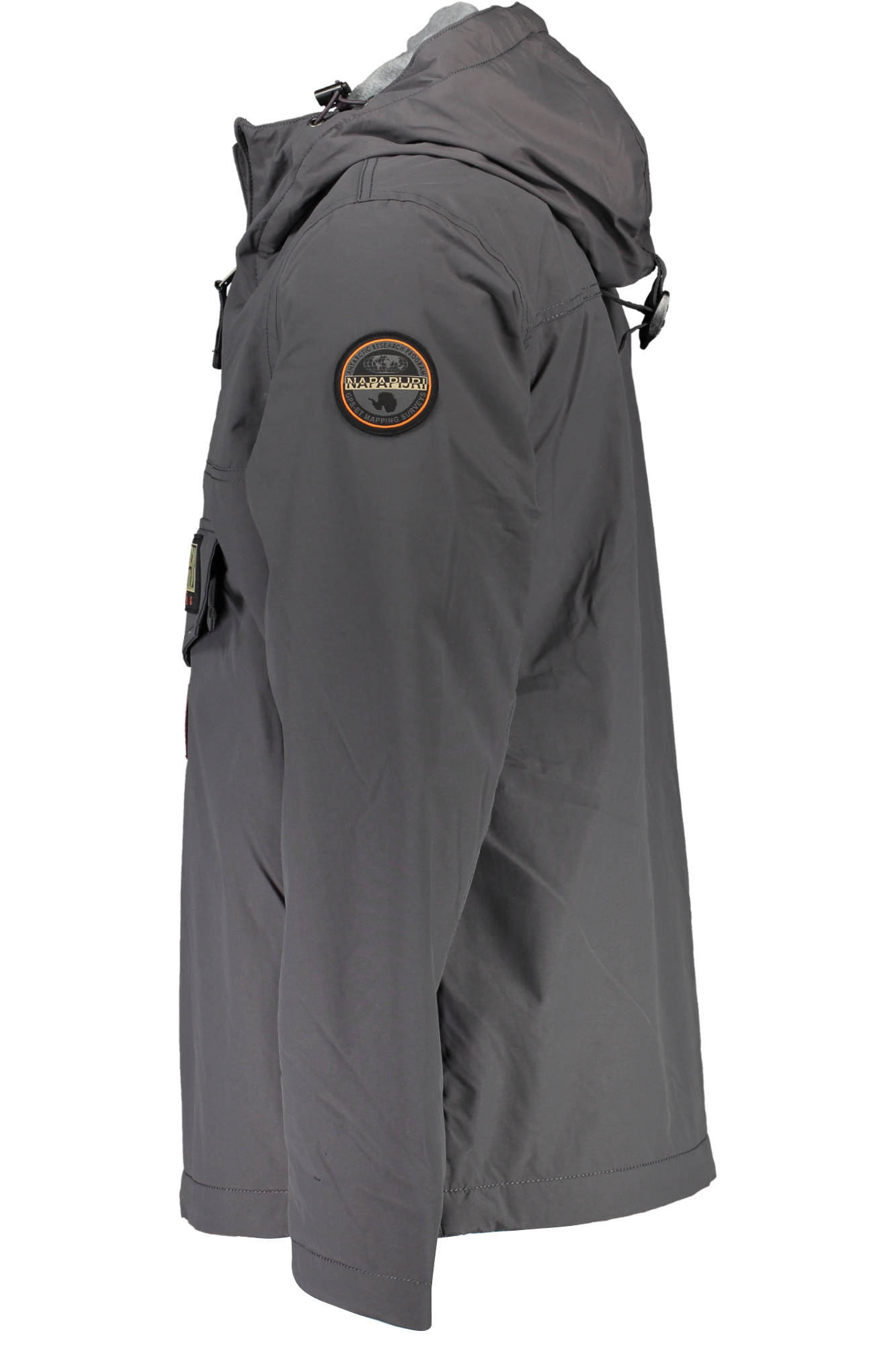 long-sleeved rainforest jacket, hood, 1 central pocket with zip and felt closure, side zip, application, logo, 30% recycled materials