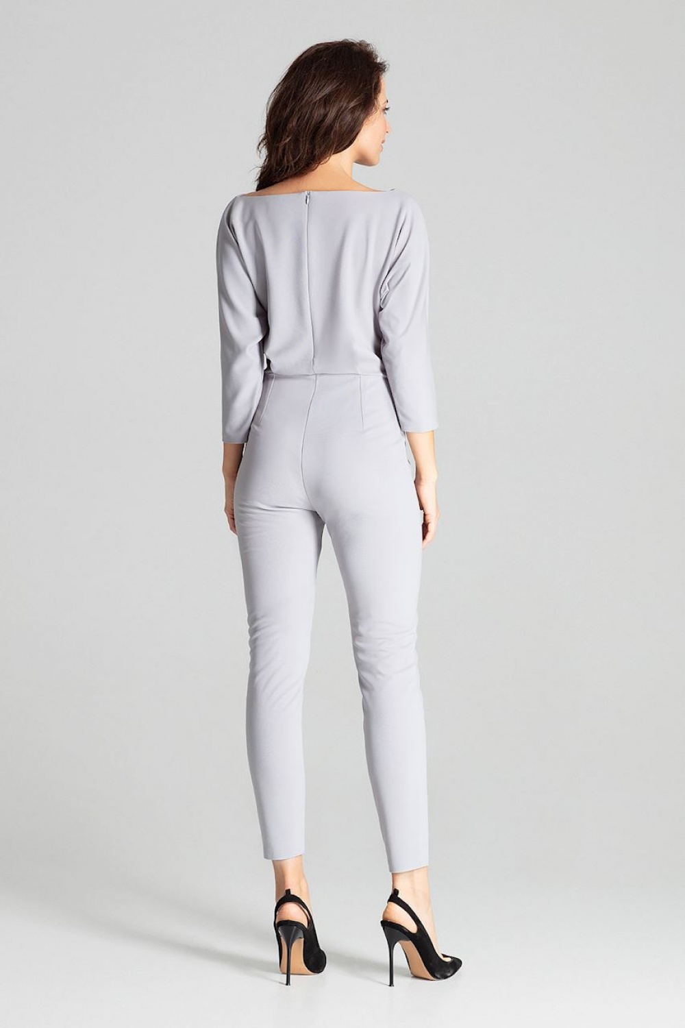 Grijze jumpsuit met 3/4 mouwen, een halfronde halsuitsnijding en asymmetrische plooien. Kimonomouwen, pijpen onderaan lichtjes taps toelopend. Geen zakken, bedekte rits aan de achterkant.