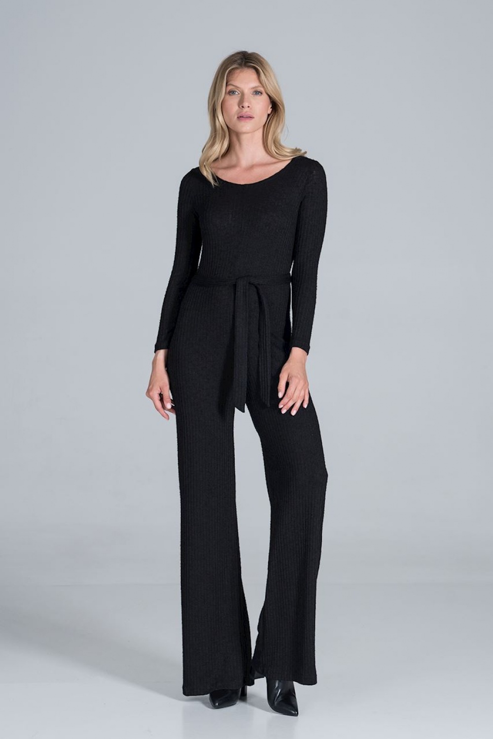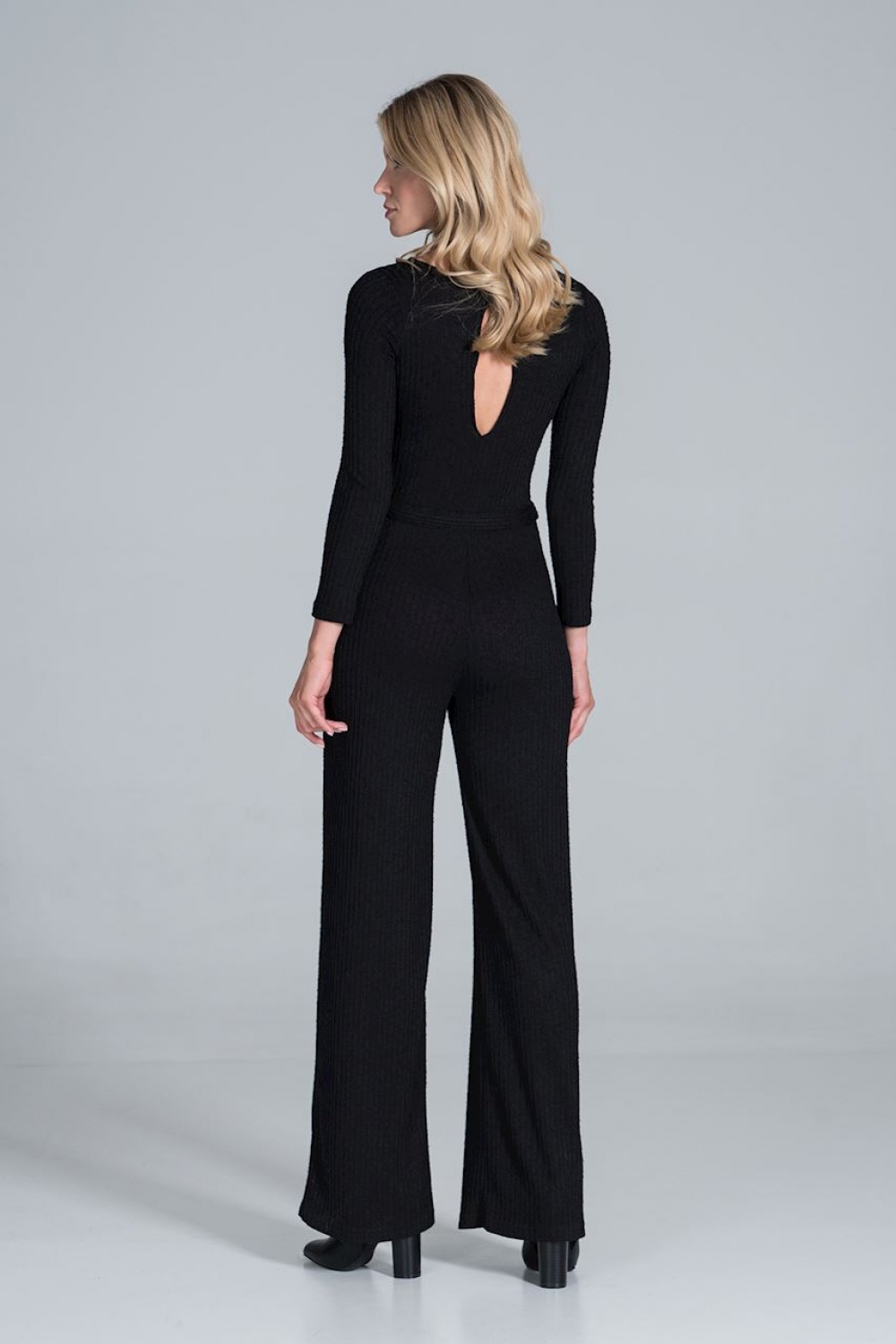 Jumpsuit met lange mouwen en wijde pijpen in een vloeiend, geribd breisel met een splitje achter en een drukknoopsluiting.