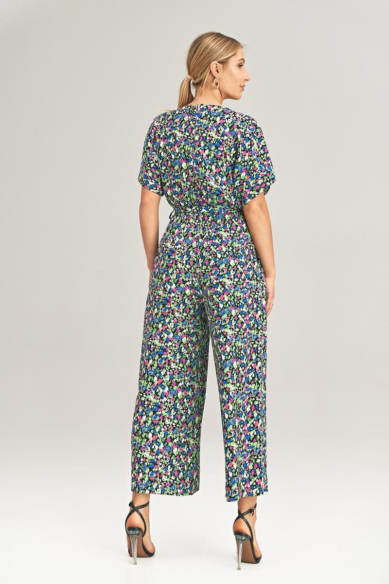 Lichte jumpsuit met wijde 7/8 broekspijpen. Voorzijde met overslag. Sluiting met drukknoop. Afhangende mouw in kimono-stijl. Met ceintuur in de taille.