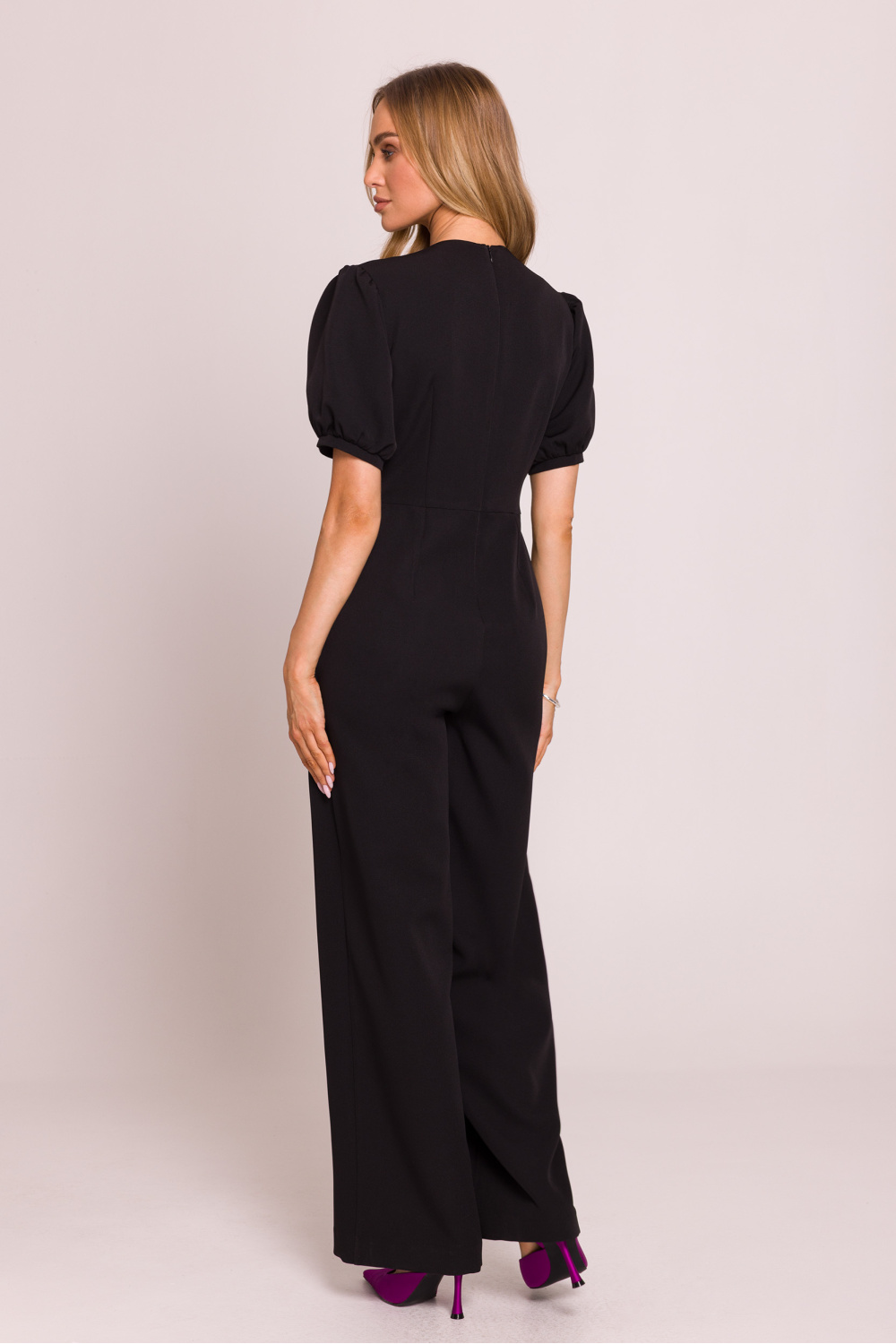 Stijlvolle jumpsuit met een vrouwelijke snit, gemaakt van hoogwaardige stof. De diepe V-hals benadrukt mooi de nek en het decolleté, terwijl de geaccentueerde taille de silhouet benadrukt. Korte pofmouwen met manchetten voegen een romantisch accent toe, terwijl licht uitlopende broekspijpen met omslagen vanaf de taille zorgen voor een elegante en casual uitstraling. Het model sluit aan de achterkant met een verborgen rits en heeft een voering aan de bovenkant voor meer draagcomfort. Het geheel is ontworpen en gemaakt in Polen met oog voor elk detail.
