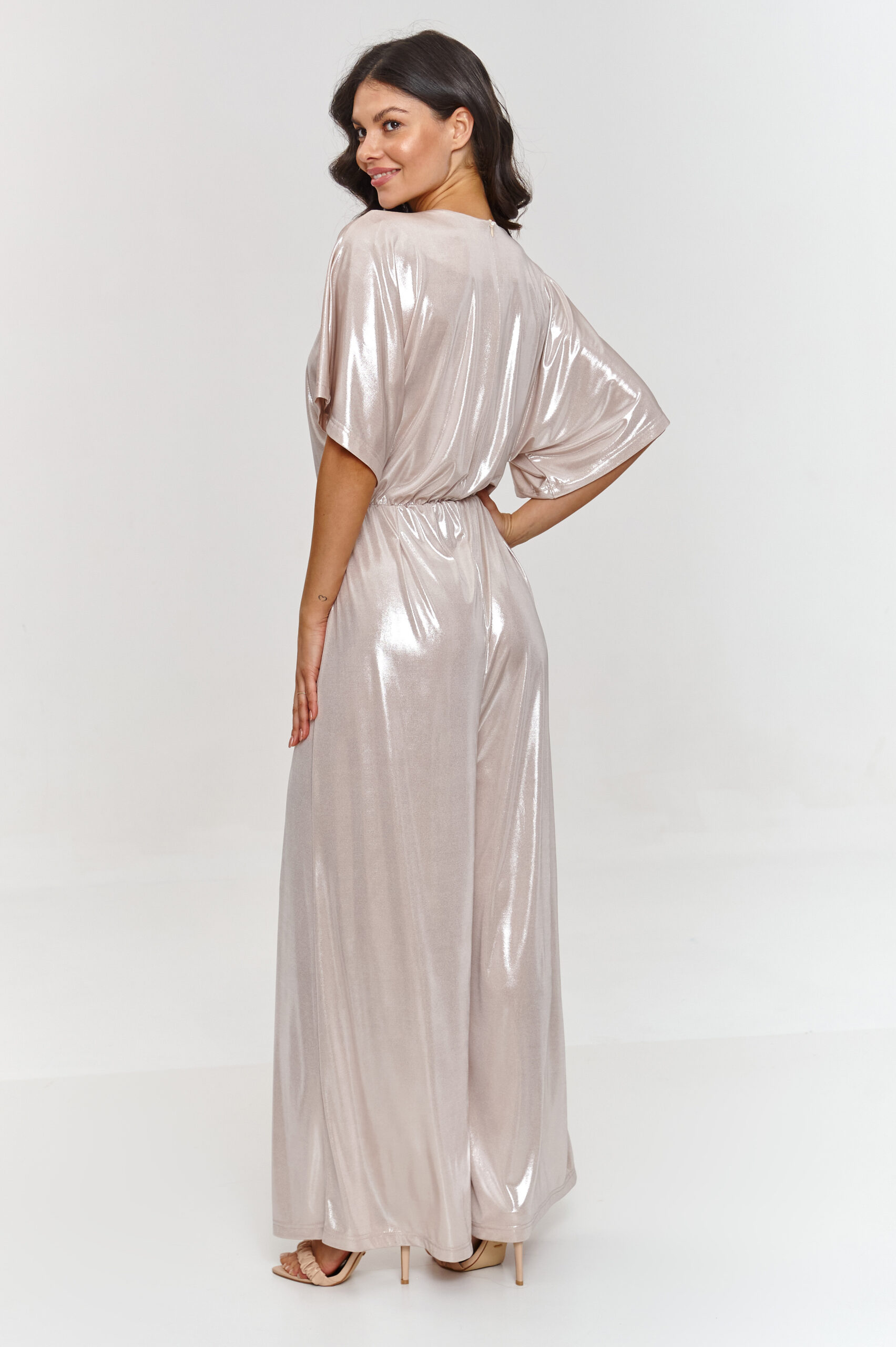 De jumpsuit is een combinatie van elegantie en comfort, die zeker de aandacht zal trekken bij elke speciale gelegenheid. De losse top met kimono-mouwen geeft hem lichtheid en vrijheid. Dit detail maakt de outfit bijzonder en stijlvol, terwijl het de bewegingen niet beperkt. De V-hals is subtiel en elegant, perfect voor het benadrukken van de nek en armen. Deze halslijn voegt sensualiteit toe en benadrukt de vrouwelijke silhouet, met behoud van een klassieke, verfijnde uitstraling. De wijde pijpen geven de jumpsuit lichtheid en verbergen eventuele figuurimperfecties, en helpen de silhouet te verlengen. De elastische tailleband garandeert een perfecte pasvorm en benadrukt het figuur, waardoor een ingesnoerde taille-effect ontstaat. Hierdoor ziet de jumpsuit er niet alleen stijlvol uit, maar voelt ook comfortabel aan gedurende de hele dag of avond. Het model is gemaakt van een delicaat materiaal met een metallic afwerking, waardoor de outfit een uitzonderlijke glans en een moderne uitstraling krijgt. De jumpsuit in metallic kleur met een V-hals is een voorstel dat je zal onderscheiden van de massa. Het moderne ontwerp en glanzende materiaal zullen ervoor zorgen dat je je zelfverzekerd en stijlvol voelt op elk feest. Het is een uitstekend alternatief voor een jurk, met gegarandeerd comfort en een unieke uitstraling.