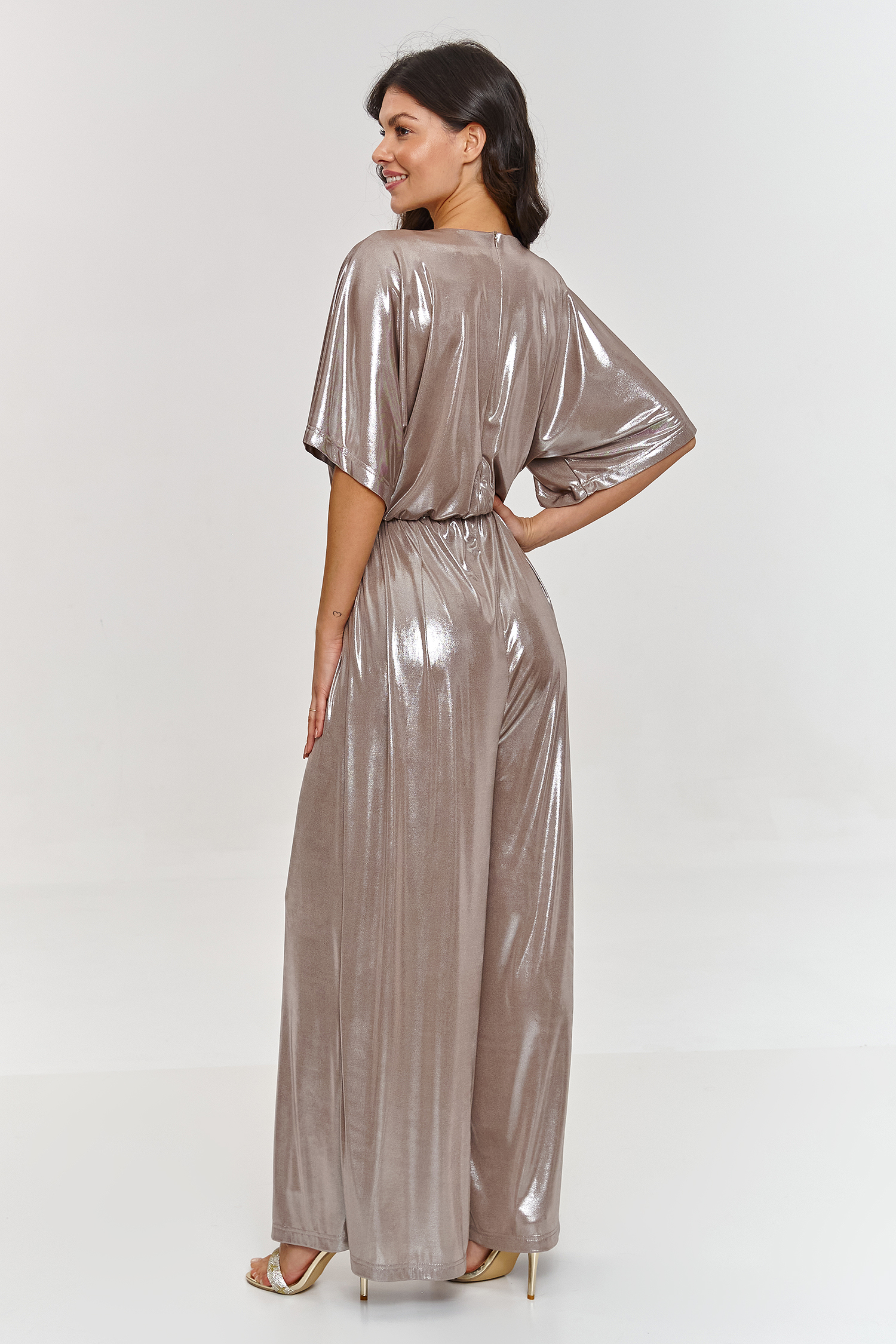 De jumpsuit is een combinatie van elegantie en comfort, die zeker de aandacht zal trekken bij elke speciale gelegenheid. De losse top met kimono-mouwen geeft hem lichtheid en vrijheid. Dit detail maakt de outfit uitzonderlijk en stijlvol, zonder de beweging te beperken. De V-hals is subtiel en elegant, perfect om de nek en armen te benadrukken. Deze halslijn voegt sensualiteit toe en benadrukt de vrouwelijke silhouet, met behoud van een klassieke, verfijnde uitstraling. De wijde pijpen geven de jumpsuit lichtheid terwijl ze de onvolkomenheden van het figuur maskeren en helpen de silhouet te verlengen. De elastische tailleband zorgt voor een goede pasvorm en benadrukt het figuur, waardoor een ingesnoerde taille-effect ontstaat. Hierdoor ziet de jumpsuit er niet alleen stijlvol uit, maar ook comfortabel gedurende de hele dag of avond. Het model is gemaakt van een delicaat materiaal met een metallic afwerking, wat de styling een unieke glans en een moderne uitstraling geeft. Een jumpsuit in een metallic kleur met een V-hals is een voorstel dat je zal onderscheiden van de menigte. Zijn moderne snit en glanzende materiaal zullen ervoor zorgen dat je je zelfverzekerd en stijlvol voelt op elk feest. Het is een uitstekend alternatief voor een jurk, met comfort en een opvallende uitstraling.