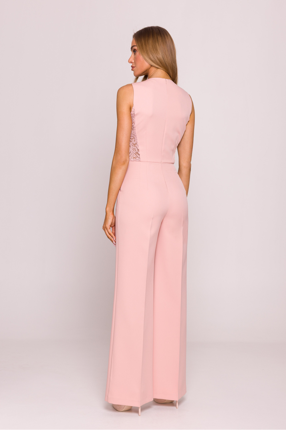 Een uniek pak dat klassieke elegantie en subtiele sensualiteit combineert. Gemaakt van glad, aangenaam aanvoelende stof, verrijkt aan de zijkanten met geometrische kanten panelen die de silhouet prachtig modelleren en lichtheid toevoegen. Het aansluitende bovenstuk met een hoge, ronde hals en zonder mouwen contrasteert met de wijde, lange broekspijpen, die elegant de benen optisch verlengen. De taille is benadrukt met een metalen versiering aan de voorkant, die een minimalistisch maar opvallend detail vormt. Aan de achterkant zorgt de verborgen rits voor gemakkelijk aantrekken, terwijl het ontbreken van zakken de zuiverheid van de vorm benadrukt. Het pak is perfect voor feesten, avondjes uit of formele bijeenkomsten. Ontworpen en gemaakt in Polen, met aandacht voor kwaliteit en details. Kant 90% nylon, 5% elastaan.