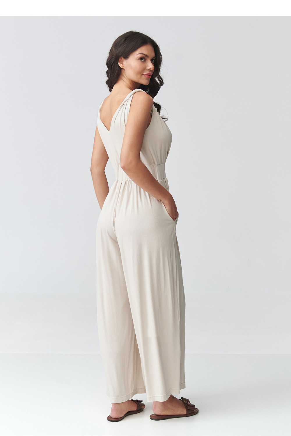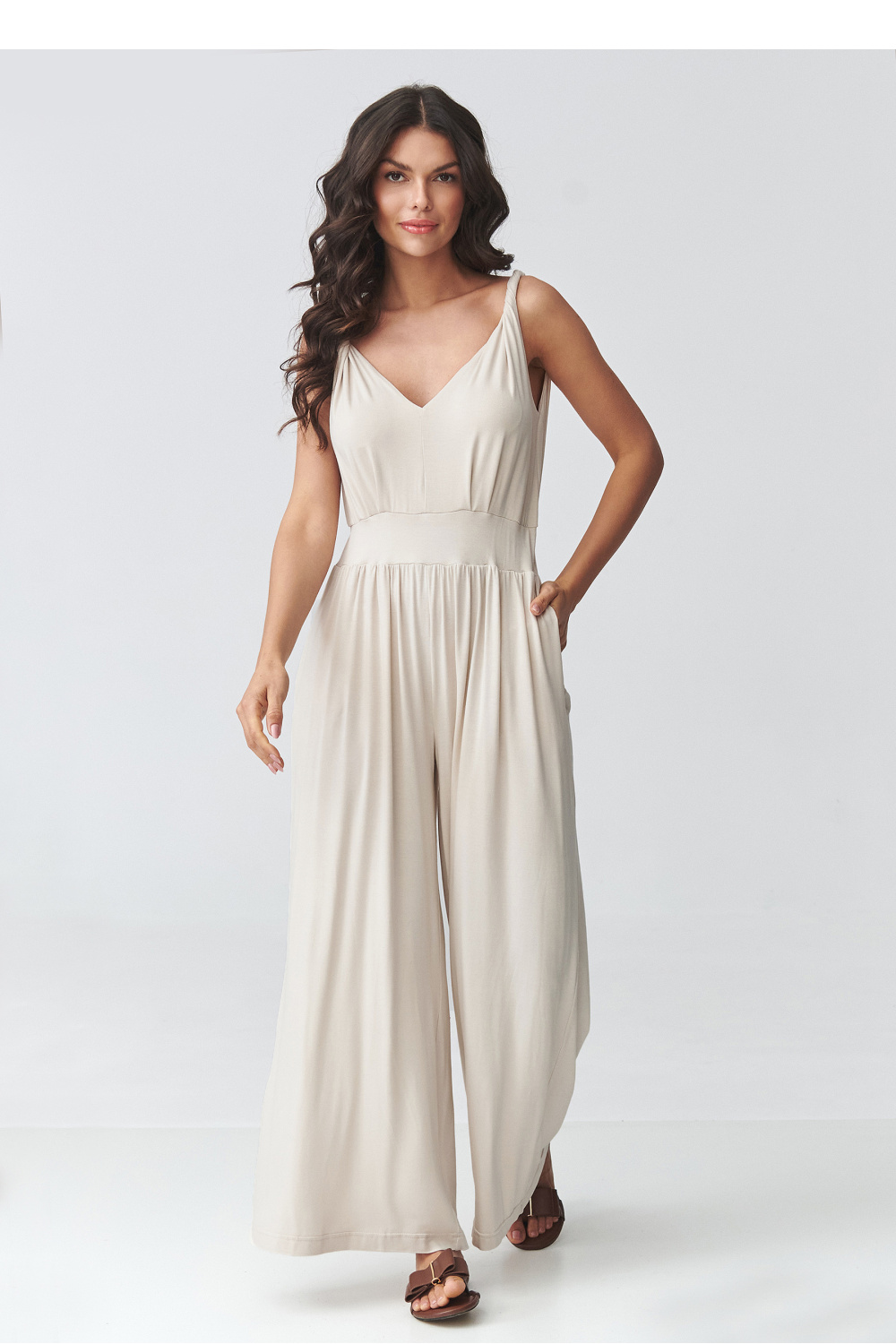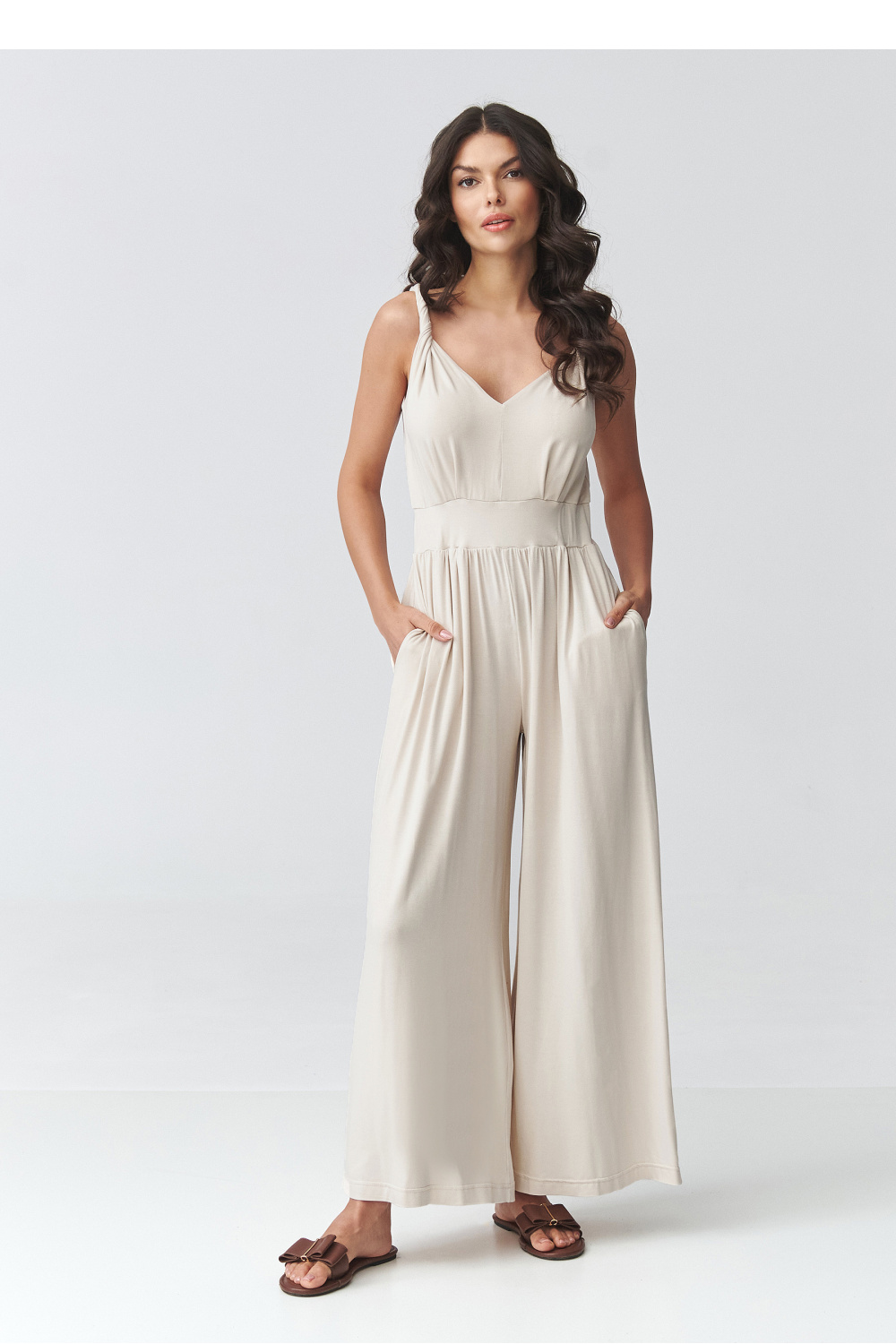 De stijlvolle dames jumpsuit met spaghettibandjes is de ideale keuze voor vrouwen die op zoek zijn naar een combinatie van elegantie en comfort. Het lichte, vloeiende materiaal valt prachtig op het lichaam en de geaccentueerde taille geeft de figuur verhoudingen en een vrouwelijk karakter. De subtiele V-hals verslankt het bovenlichaam en voegt lichtheid toe aan het geheel. Het model heeft wijde pijpen die zorgen voor bewegingsvrijheid en passen bij de huidige trends. Hierdoor is de lange dames jumpsuit perfect voor zowel dagelijks gebruik als voor speciale gelegenheden. Het is een geweldig alternatief voor een jurk, ideaal als jumpsuit voor een bruiloft, receptie, vakantie of date. Het universele ontwerp maakt verschillende styling mogelijk, in combinatie met sandalen creëert het een lichte, zomerse look, en met hakken krijgt het een meer elegante uitstraling. Als je op zoek bent naar een tijdloos model, is deze trendy jumpsuit met wijde pijpen een uitstekende keuze.