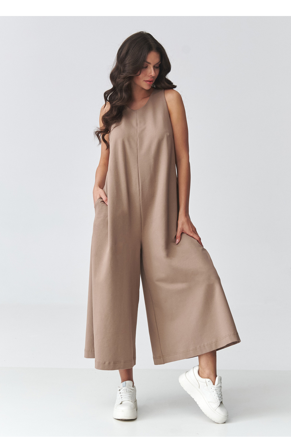 Uniek damesoverall dat minimalisme, comfort en tijdloze elegantie combineert. Deze lange overall met wijde pijpen is een ideale keuze voor vrouwen die houden van bewegingsvrijheid en een modieuze, moderne stijl. De losse pasvorm valt mooi op het figuur, benadrukt de sterke punten en zorgt voor comfort gedurende de hele dag. Het model heeft een klassieke, hoge halslijn en zorgvuldig afgewerkte details die het een universeel karakter geven. Hierdoor is deze elegante damesoverall geschikt voor zowel dagelijkse outfits als meer formele looks voor werk, vergaderingen of familiefeesten. Voeg de juiste accessoires toe om een modieuze en samenhangende look te creëren. De wijde pijpen geven het silhouet een luchtig gevoel en passen bij de huidige trends. Dit is een uitstekend alternatief voor een jurk, een overall voor dagelijks gebruik en speciale gelegenheden waarmee je stijlvol kunt opvallen terwijl je volledig comfort behoudt.