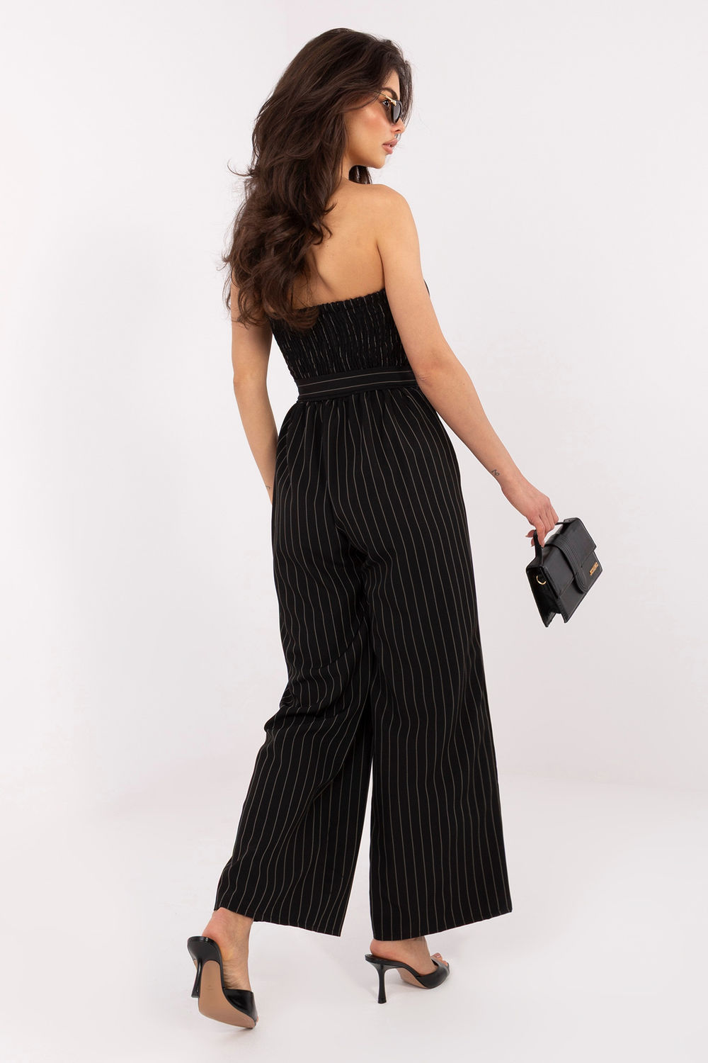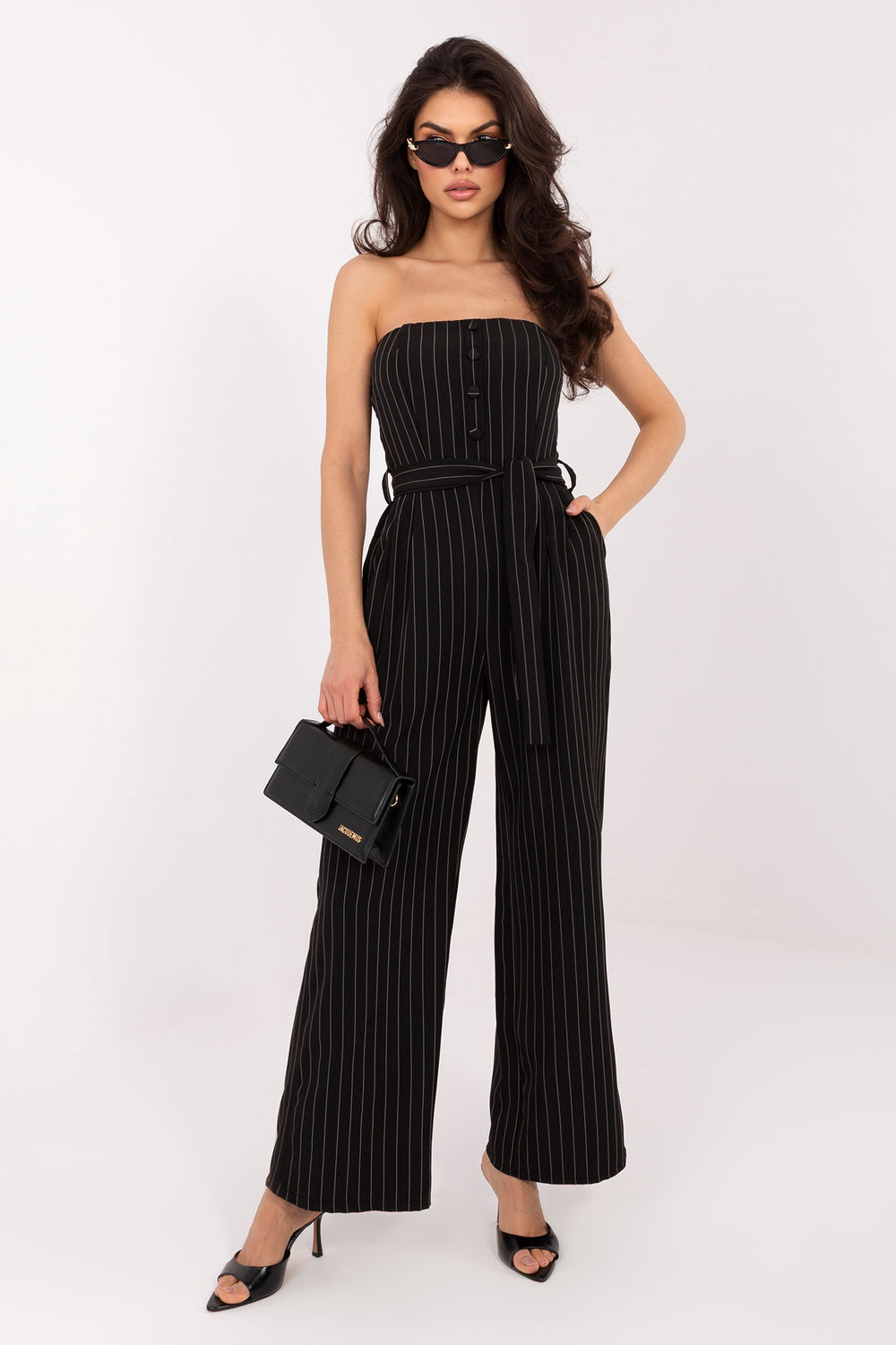 De gestreepte damesoverall is een elegante en functionele keuze die zowel geschikt is voor dagelijkse outfits, voor werk als voor meer formele gelegenheden. De combinatie van klassiek met een moderne snit zorgt voor een comfortabele en stijlvolle outfit. Het model is gemaakt van polyester gemengd met elastaan, wat zorgt voor lichtheid, een subtiele elasticiteit en comfortabel dragen gedurende de hele dag. De overall heeft lange, wijde pijpen, geen mouwen en een rechthoekige halslijn die de schouderlijn subtiel accentueert. Ingebouwde, verstevigde cups zorgen voor de juiste ondersteuning van de borst en een esthetische vorm. De voorkant is versierd met decoratieve knopen en in de taille bevindt zich een strikceintuur die perfect kan worden aangepast en de silhouet accentueert. De overall heeft handige insteekzakken en plooien op de rug met elastiek voor extra comfort en pasvorm. Dankzij het dominante streepmotief krijgt het geheel een moderne uitstraling, terwijl de wijde pijpen stijl en bewegingsvrijheid toevoegen. Dit is een veelzijdige overall voor vrouwen die elegantie, comfort en praktische oplossingen waarderen in één.