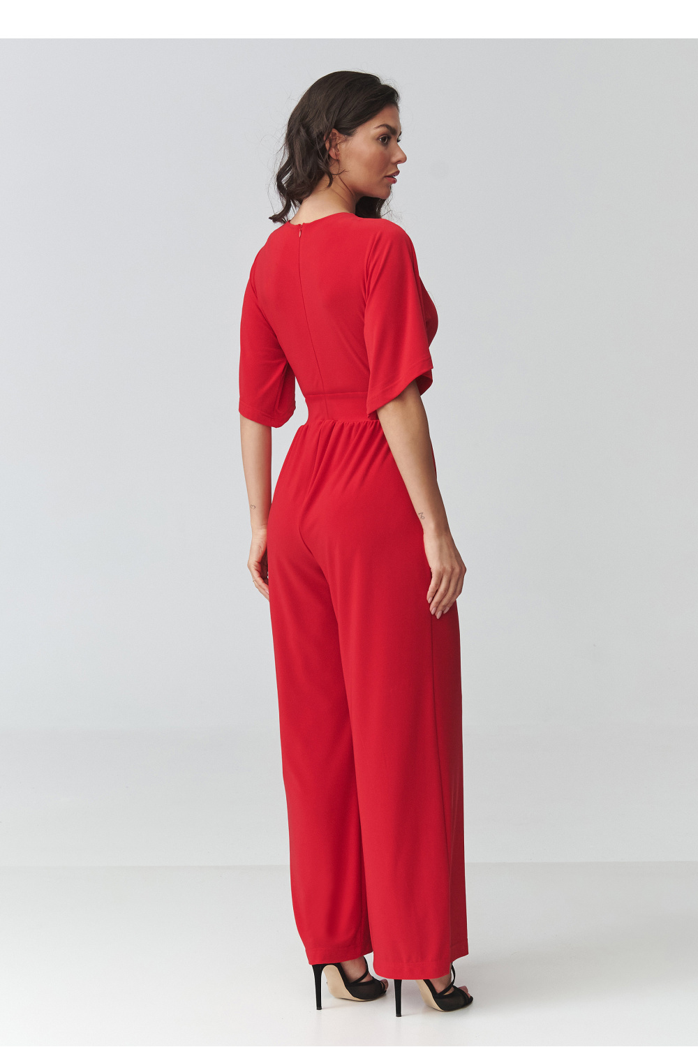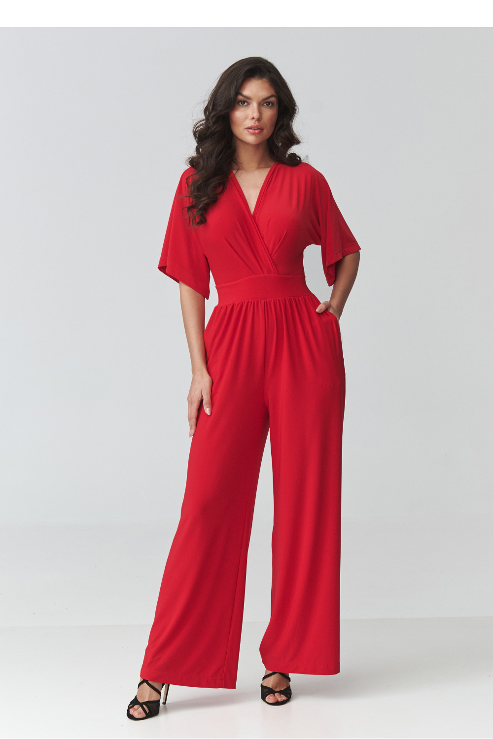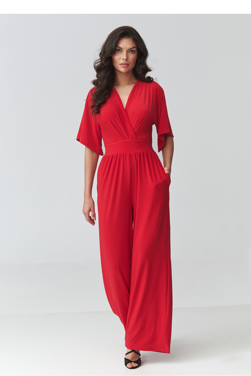 Stijlvolle damesoverall is een ideaal voorstel voor vrouwen die elegantie, comfort en tijdloze stijl waarderen. Het model onderscheidt zich door een vrouwelijke snit met een overslaghalslijn, die subtiel de silhouet benadrukt en de outfit lichtheid en klasse geeft. De getailleerde taille modelleert prachtig de lichaamsverhoudingen, terwijl de wijde pijpen een modern karakter geven en volledige bewegingsvrijheid bieden. Deze elegante overall voor speciale gelegenheden zal perfect zijn voor feesten, familiebijeenkomsten, zakelijke ontmoetingen of avondjes uit. Dankzij het zorgvuldig ontworpen model combineert het comfortabel dragen met een trendy uitstraling, waardoor het een geweldig alternatief is voor de klassieke jurk. Korte mouwen zorgen voor comfort, terwijl praktische zakken de functionaliteit van het model vergroten.