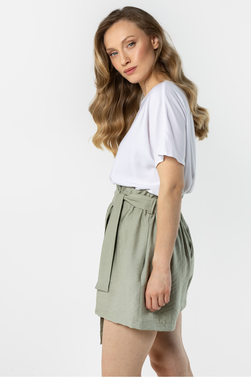 Lichte shorts met een losse pasvorm zijn de ideale keuze voor warme dagen. De hoge taille met gerimpelde taille benadrukt mooi de silhouet, en de strik in de taille voegt een vrouwelijk karakter toe aan het geheel. Lossere pijpen zorgen voor comfort en bewegingsvrijheid, en praktische zakken verhogen het draagcomfort. Dit model zal perfect zijn in alledaagse, zomerse outfits.
