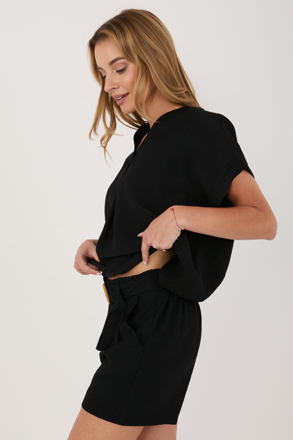 Stijlvolle en comfortabele dames shorts gemaakt van licht, aangenaam aanvoelend materiaal zijn een ideale keuze voor dagelijks gebruik. Het model, gemaakt van een mix van viscose en polyamide, zorgt voor comfort, ademend vermogen en duurzaamheid, waardoor het perfect is voor warmere dagen. De shorts hebben een korte, rechte pijp die zorgt voor bewegingsvrijheid en een veelzijdige uitstraling die past bij veel verschillende stijlen. In de taille is een elastische band genaaid die zich aanpast aan het silhouet en comfort biedt zonder te hoeven vastmaken. Een extra voordeel zijn de praktische insteekzakken en de riem met sluiting die de taille accentueert en het geheel een modieus karakter geeft. Het gladde patroon maakt de shorts gemakkelijk te combineren met zowel een casual T-shirt als een meer elegante blouse. Dit is een uitstekend voorstel voor dagelijkse uitstapjes, wandelingen of bijeenkomsten in zomerse stijl.