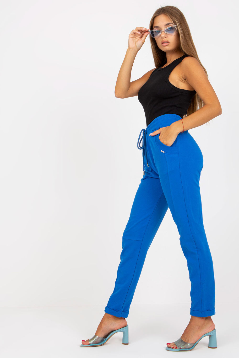 Damesbroek met hoge tailleband en elastiek in de taille. Steekzakken aan de zijkanten.