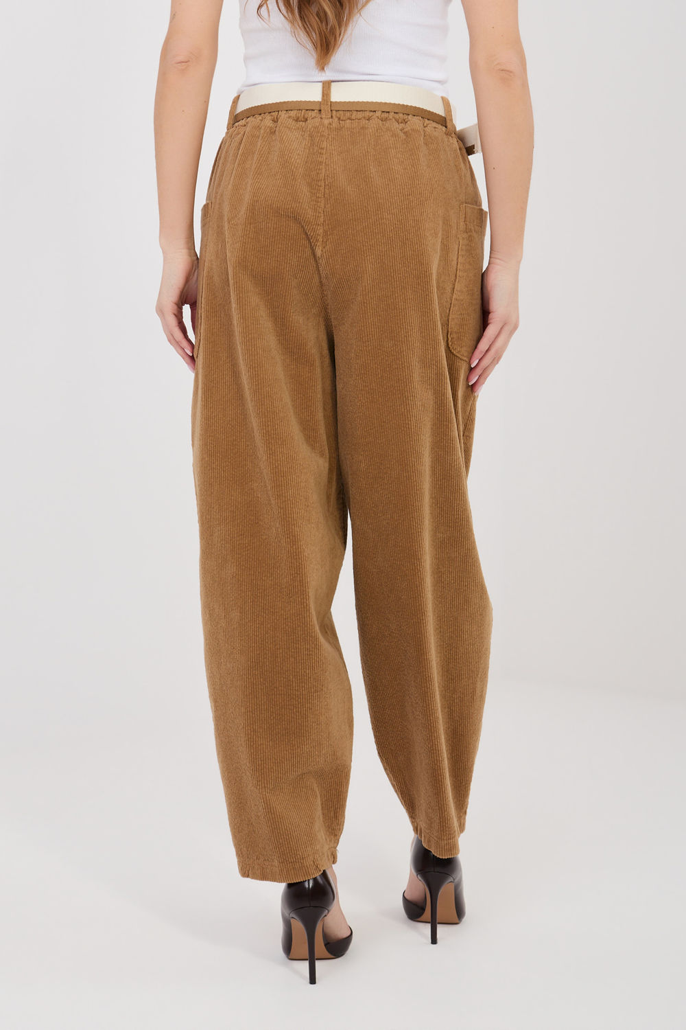 Stijlvolle damesbroeken gemaakt van corduroy zijn een uitstekend voorstel voor dagelijkse, casual styling. Het wortelmodel kenmerkt zich door een lossere pasvorm rond de heupen en smal toelopende pijpen, wat zorgt voor comfortabel dragen en een moderne uitstraling. Het model met hoge taille benadrukt mooi de taille en verlengt optisch het silhouet. In de taille is een elastische band genaaid, die zorgt voor een comfortabele pasvorm zonder dat het nodig is om te sluiten. Een extra voordeel is de gesp die de taille benadrukt en een stijlvol element van de afwerking vormt. De broek heeft geen klassieke sluiting, wat het draagcomfort verhoogt. Ze zijn uitgerust met open, ingestikte zakken aan de zijkanten, praktisch en voegen een ontspannen karakter toe aan het geheel. Gemaakt van een hoogwaardige mix van katoen en elastaan, ze zijn zacht, aangenaam om aan te raken en licht elastisch, waardoor ze goed passen bij het silhouet. Het gladde patroon maakt het model veelzijdig en gemakkelijk te stylen, ideaal voor dagelijks gebruik, werk of een ontmoeting.