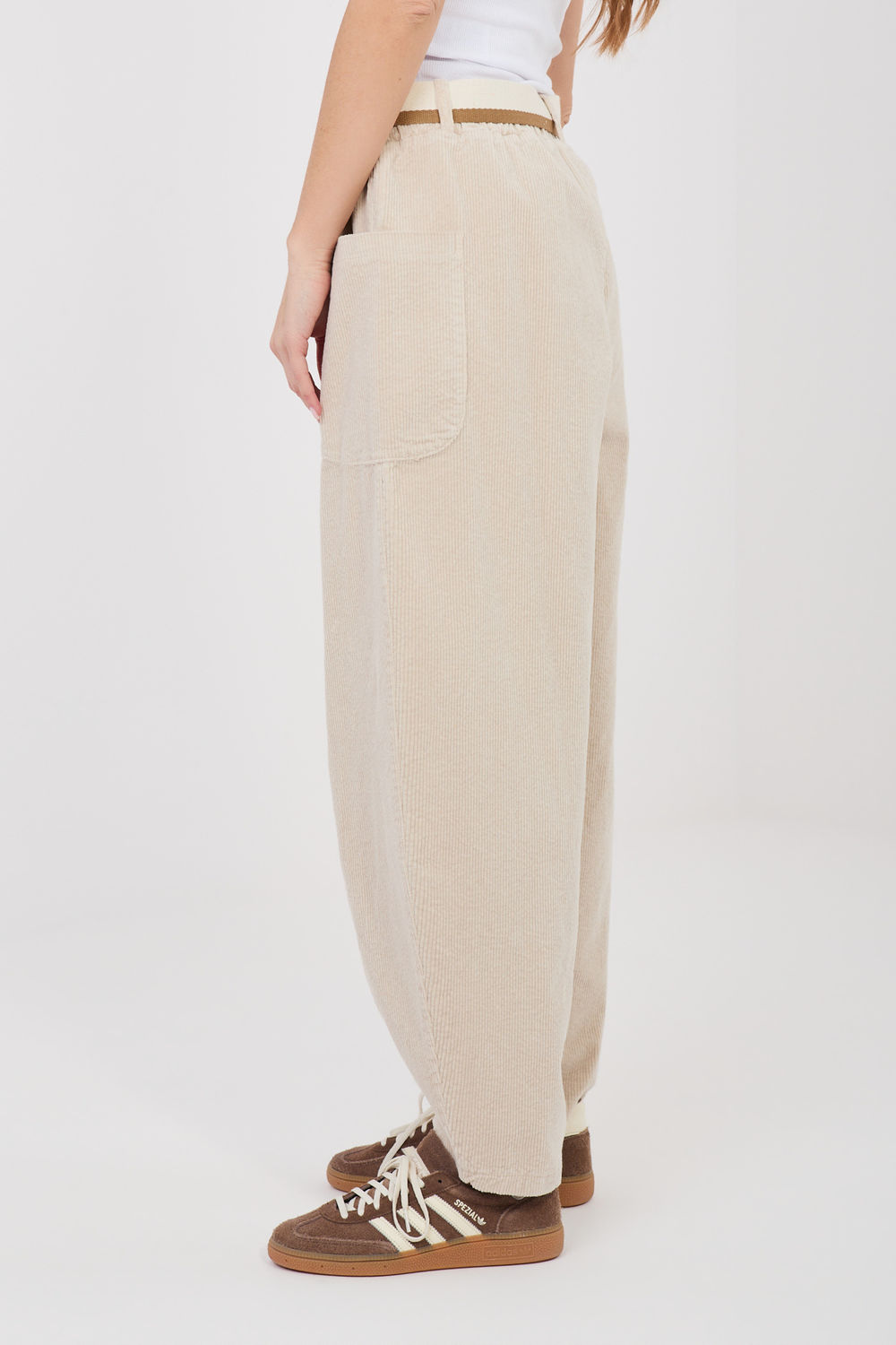 Stijlvolle damesbroeken gemaakt van ribfluweel zijn een uitstekend voorstel voor dagelijkse, casual styling. Het wortelmodel kenmerkt zich door een lossere vorm bij de heupen en taps toelopende pijpen, wat zorgt voor comfortabel dragen en een moderne uitstraling. Het hoge model benadrukt mooi de taille en verlengt optisch het silhouet. In de taille is een elastische band genaaid, die zorgt voor een comfortabele pasvorm zonder te hoeven sluiten. Een extra voordeel is de gesp, die de taille benadrukt en een stijlvolle afwerkingselement vormt. De broek heeft geen klassieke sluiting, wat het gebruiksgemak verhoogt. Ze zijn voorzien van open, insteekzakken aan de zijkanten, praktisch en voegen een casual karakter toe aan het geheel. Gemaakt van hoogwaardige katoen en elastaanmix, ze zijn zacht, aangenaam om aan te raken en licht elastisch, waardoor ze goed aansluiten op het silhouet. Het gladde patroon maakt het model veelzijdig en gemakkelijk te stylen, ideaal voor dagelijks gebruik, werk of een ontmoeting.