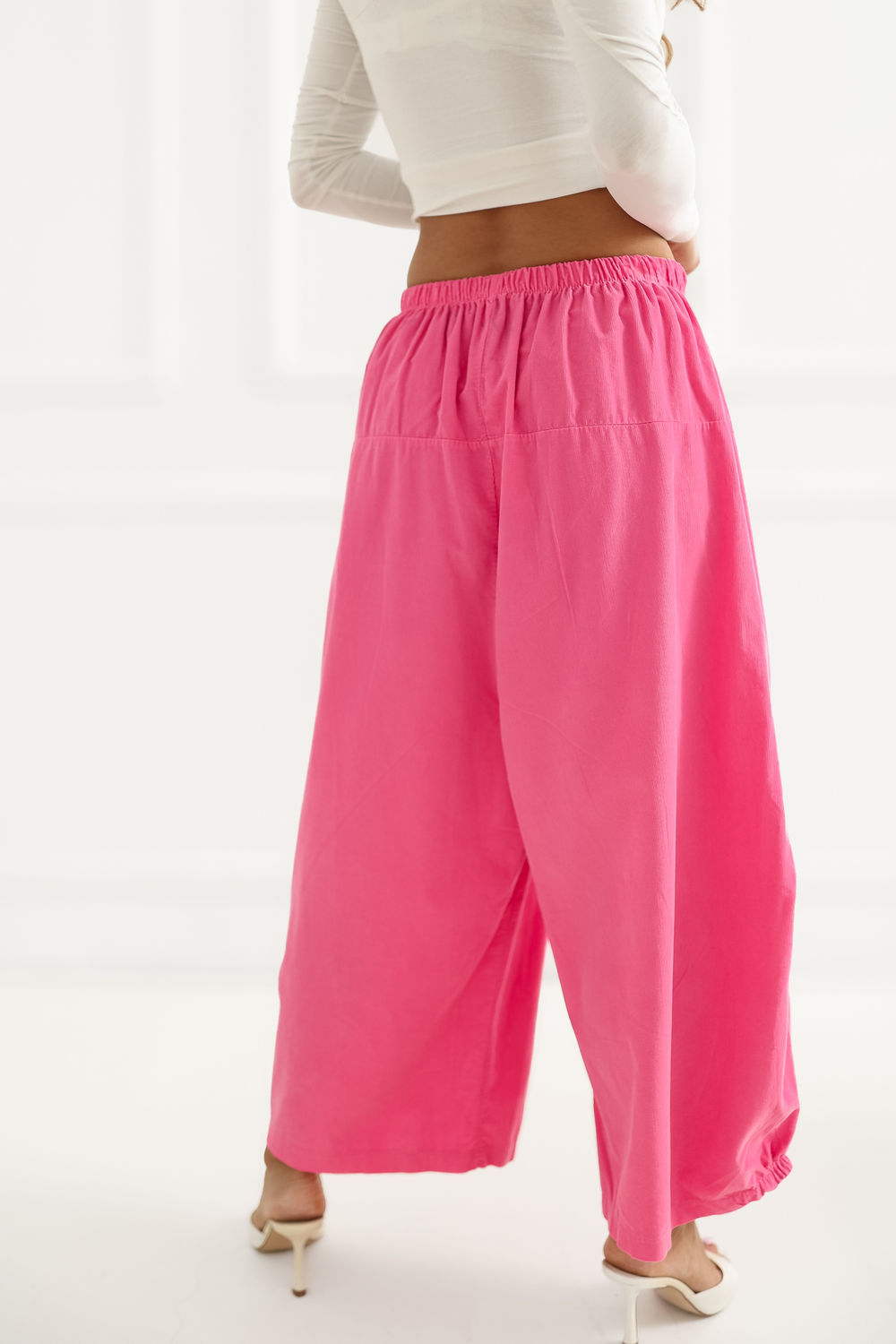 Dames fluwelen broek in een losse Aladdin-stijl, ideaal voor dagelijks gebruik. Gemaakt van zacht en aangenaam aanvoelend katoen, zorgen voor comfortabel dragen en ademend vermogen. Met een hoge taille en een elastische tailleband die zich aanpast aan de silhouet en de hele dag comfort garandeert. Brede 7/8 lengte pijpen geven lichtheid en een modieus karakter aan het geheel. Broek met een glad patroon, zonder sluiting en zakken, benadrukken hun minimalistische stijl en losse, relaxte uitstraling.