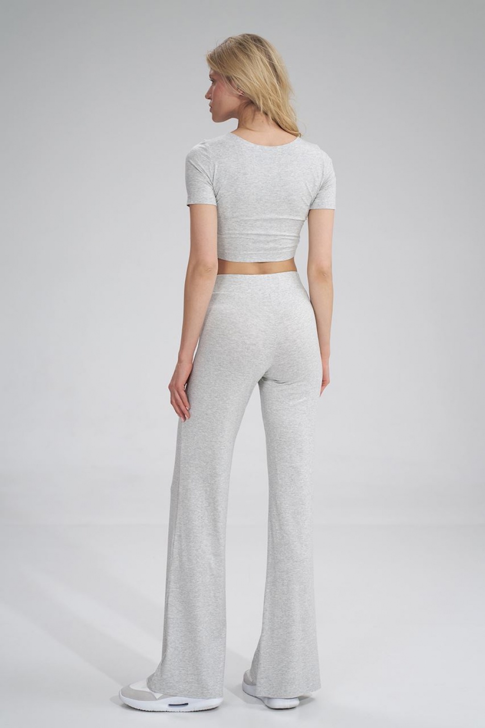 Lange broek met klokkende onderkant, een brede elastische tailleband, geen zakken en geen ritssluiting.
