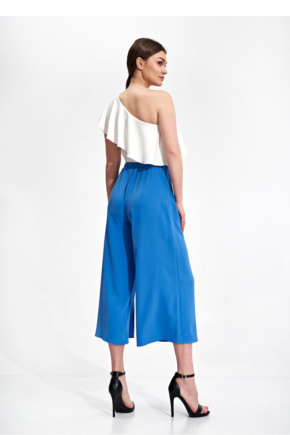 Broek met klokkende onderkant 7/8, decoratieve split onderaan de broekspijp. Tailleband met decoratieve elastische band met bies. Geen zakken, geen sluiting.