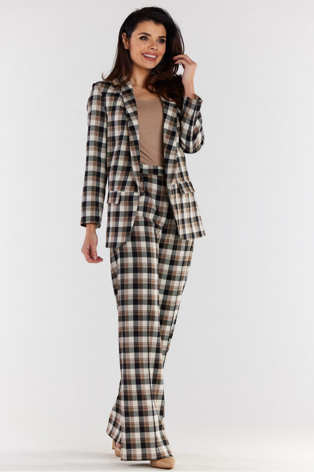 Broek met hoge taille en wijde pijpen zonder zakken. De broek rits en knoop aan de voorkant. Ze passen perfect bij een jasje in dezelfde kleur.