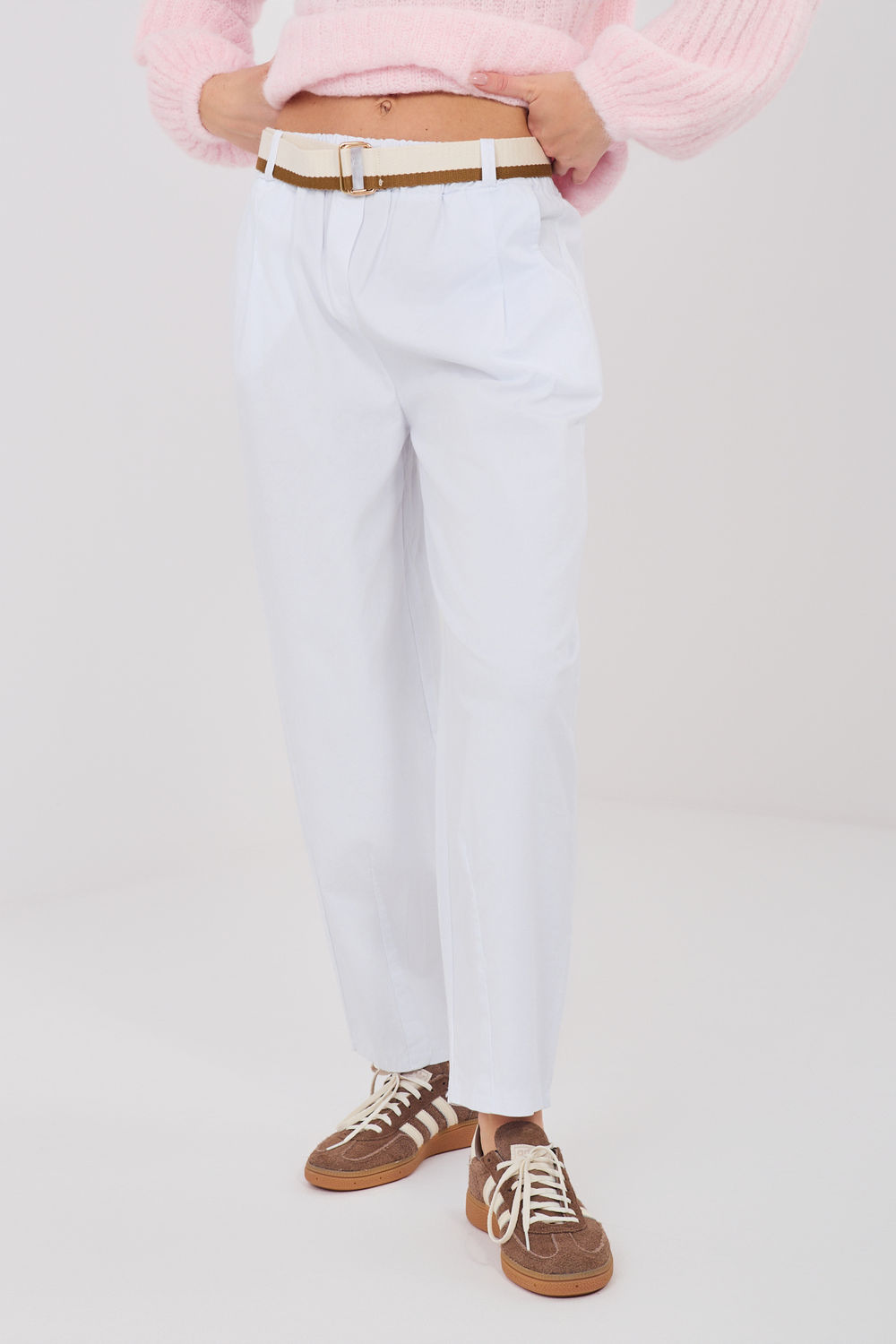 Comfortabele en stijlvolle wortel gesneden broek, ideaal voor dagelijkse, casual styling. Gemaakt van hoogwaardig katoen met een vleugje elastaan, wat zorgt voor comfort en lichtheid bij het dragen en een subtiele elasticiteit. De broek heeft een hoge taille en de pijpen zijn smal en reiken tot 7/8 lengte, wat een moderne uitstraling geeft. In de taille zit een elastische band en daarnaast zijn de broek uitgerust met een riem met sluiting mogelijkheid, waardoor een perfecte pasvorm mogelijk is. Praktische zijzakken verhogen de functionaliteit en het gladde patroon zorgt ervoor dat ze gemakkelijk te combineren zijn met verschillende kledingstukken. Deze broek is een uitstekende keuze voor mensen die comfort, bewegingsvrijheid en een moderne casual look waarderen.
