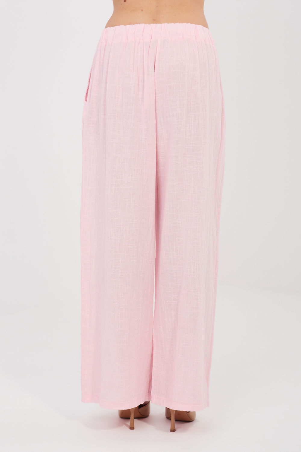 Stijlvolle damesbroek met wijde pijpen, die comfort combineert met een modieuze, relaxte stijl. Het model heeft wijde pijpen, waardoor het volledige bewegingsvrijheid biedt en perfect aansluit bij de huidige trends. De broek is gemaakt van hoogwaardig katoen, dat zacht, luchtig en aangenaam voor de huid is, waardoor het perfect is voor dagelijks gebruik. Het gladde patroon benadrukt hun universele karakter en vergemakkelijkt het combineren met veel verschillende outfits. Het hoge model benadrukt de taille prachtig en de tailleband zorgt voor een comfortabele pasvorm. Een extra voordeel zijn de praktische insteekzakken aan de zijkant, die de functionaliteit van de broek vergroten. Dit is een uitstekend voorstel voor zowel casual als meer elegante outfits.