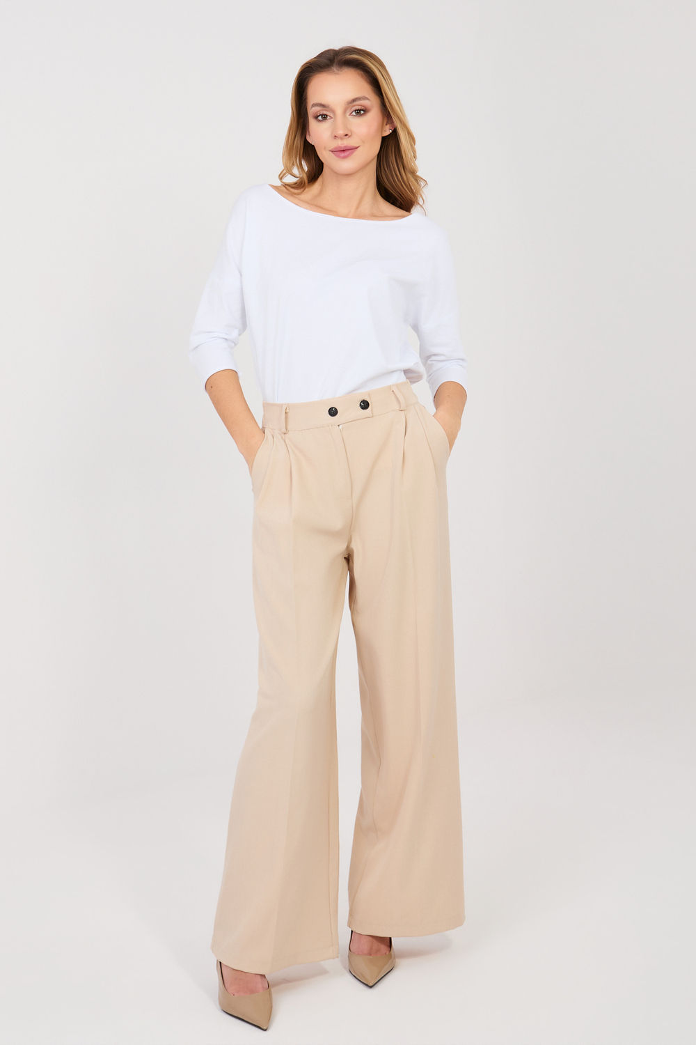 De elegante wijde damesbroek is een uitstekende keuze voor dagelijks gebruik, op het werk en voor meer formele gelegenheden. Gemaakt van hoogwaardig polyester met een vleugje elastaan, zorgen ze voor comfort, duurzaamheid en een subtiele elasticiteit die zorgt voor bewegingsvrijheid. Het gladde materiaal geeft ze een klassiek en tijdloos karakter. Het hoge taille model benadrukt prachtig de taille en verlengt optisch het silhouet, terwijl de lange, wijde pijpen de outfit lichtheid en elegantie geven. De broek sluit met een rits en knoop, wat zorgt voor een goede pasvorm. Praktische, zijdelingse insteekzakken vergroten de functionaliteit en het draagcomfort. Ze passen perfect bij zowel een blouse en een blazer als bij een meer casual blouse.