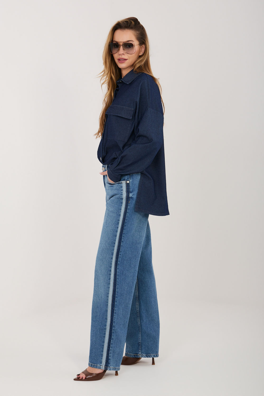 Dames jeans met rechte pijpen zijn een tijdloos model dat perfect is voor alledaagse, casual outfits. De rechte snit van de pijpen zorgt voor comfort en een veelzijdige uitstraling, waardoor de broek gemakkelijk te combineren is met zowel sportieve als meer klassieke kledingstukken. De broek is gemaakt van een mix van katoen en elastaan, waardoor de stof zacht aanvoelt, ademend is en licht elastisch, waardoor hij goed aansluit op het lichaam en comfort biedt gedurende de hele dag. Het model heeft een gemiddelde (reguliere) taille, wat zorgt voor comfort en een natuurlijke pasvorm in de taille. De jeans hebben een glad patroon en worden geaccentueerd door decoratieve stroken langs de zijkanten van de pijpen, die een moderne en modieuze touch toevoegen. De broek sluit met een rits en knoop, wat zorgt voor een klassiek en comfortabel gebruik. Daarnaast zijn ze voorzien van handige steekzakken, wat de functionaliteit van het model vergroot. Dit is de ideale keuze voor dagelijks gebruik naar werk, voor een wandeling of een ontmoeting met vrienden, wanneer comfort en stijl belangrijk zijn.