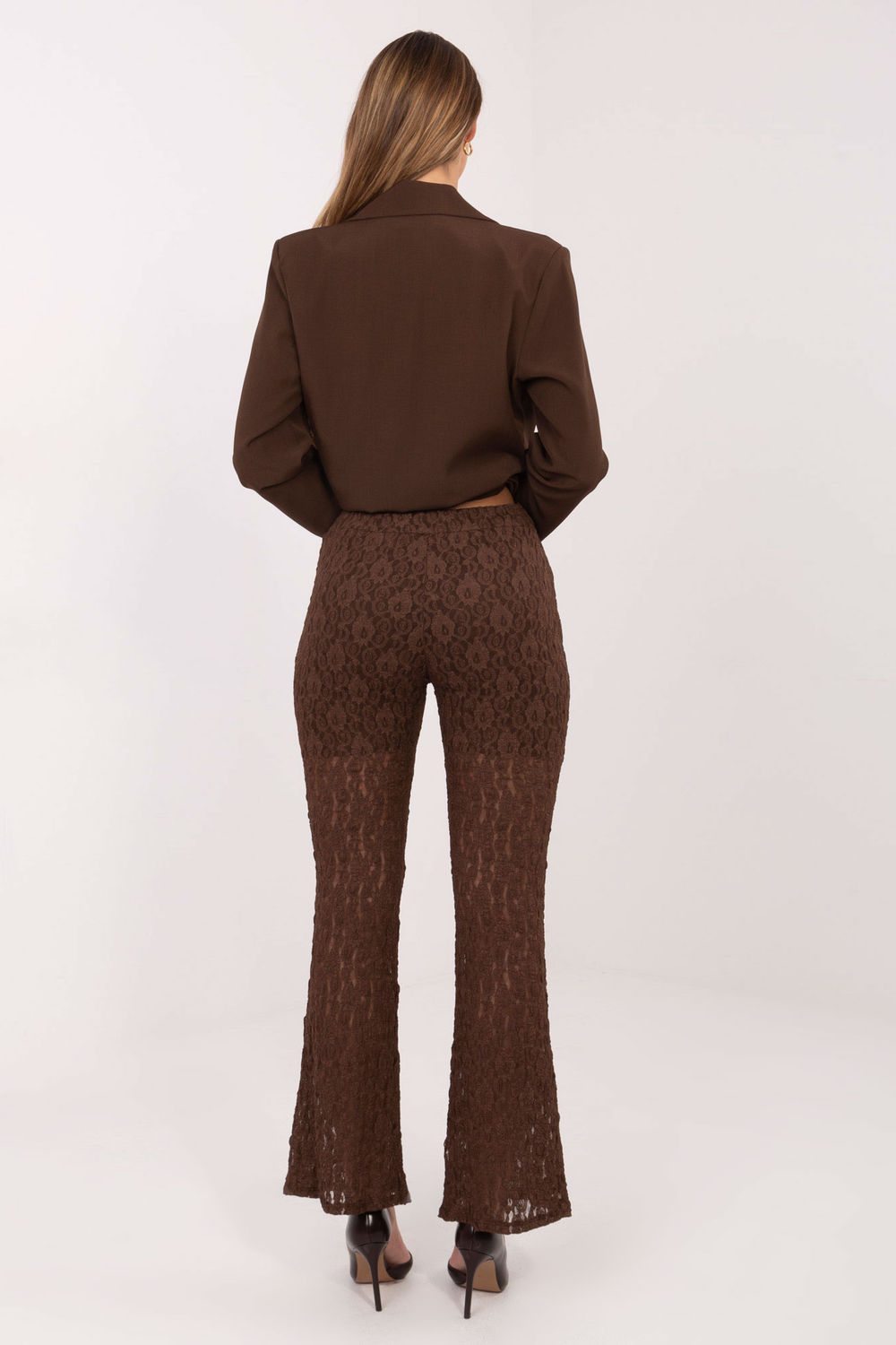 Stijlvolle kanten damesbroek is een uniek model dat stijl en comfort combineert. Gemaakt van een mix van viscose en elastaan, ze onderscheiden zich door een gevarieerde textuur van het materiaal, die ze een subtiel decoratief karakter geeft. De rechte snit en lange pijpen creëren een tijdloze, slanke silhouet. Een elastische tailleband zorgt voor een comfortabele pasvorm, en het ontbreken van sluitingen en zakken benadrukt de minimalistische, elegante stijl. De broek heeft een voering aan de bovenkant, wat zorgt voor meer draagcomfort en zorgt voor een perfecte pasvorm van het materiaal. Dit model is perfect voor zowel dagelijks gebruik als voor formele gelegenheden of feestjes, en voegt klasse en verfijning toe aan de outfit.