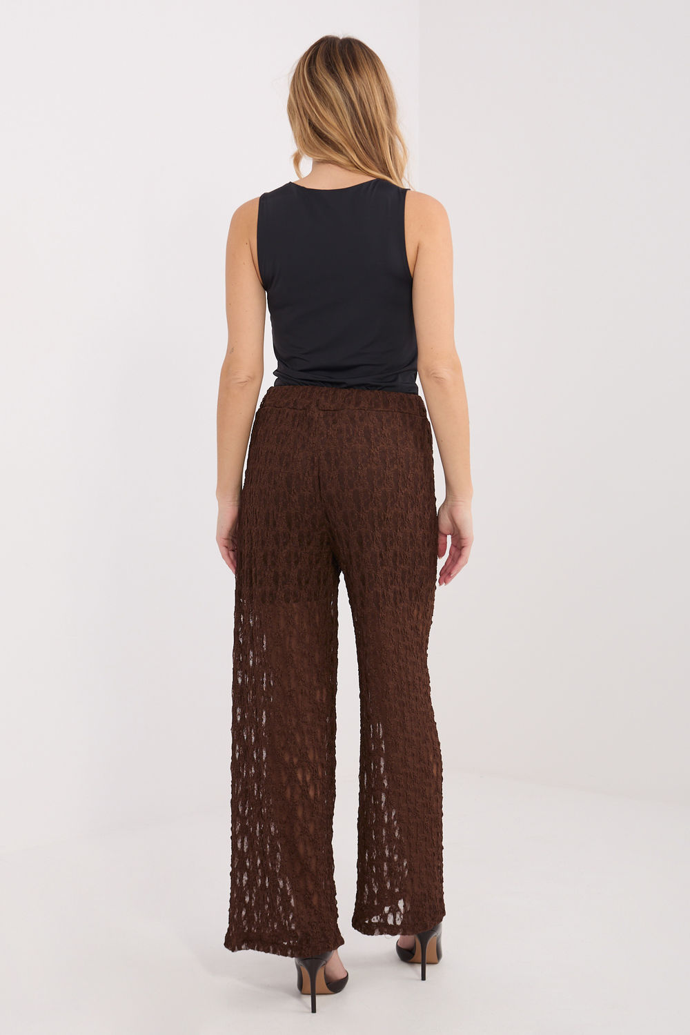 Stijlvolle wijde kanten damesbroek is een stijlvolle keuze die perfect is voor zowel dagelijkse als formele gelegenheden of feestjes. Het model combineert draagcomfort met een uniek, vrouwelijk ontwerp. De broek is gemaakt van een mix van viscose en elastaan, wat zorgt voor zachtheid, elasticiteit en een comfortabele pasvorm bij de silhouet. De gevarieerde textuur van het materiaal geeft het geheel een elegante uitstraling en benadrukt de decoratieve stijl van de kant. De hoge taille en elastische tailleband accentueren de taille op een mooie manier en zorgen voor comfort gedurende de hele dag. De wijde pijpen in wide leg stijl verlengen optisch de benen en geven het silhouet een luchtig gevoel. Het model heeft geen sluiting en wordt over de heupen gedragen, wat praktisch en comfortabel is in het gebruik. De voering aan de bovenkant zorgt voor de juiste bedekking en draagcomfort, zonder het delicate uiterlijk van het materiaal te verstoren. Dit is een uitstekende keuze voor vrouwen die elegantie willen combineren met een moderne snit en comfort.