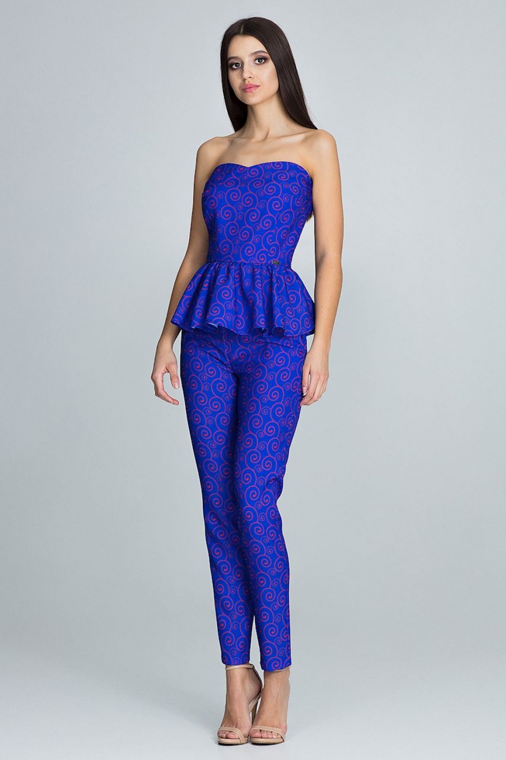 Een elegante set van een rechte broek met een korset afgewerkt met een volant, geeft onderscheidend vermogen en vrouwelijkheid. Een modieuze snit in een eenvoudige uitvoering past bij vele stijlen.