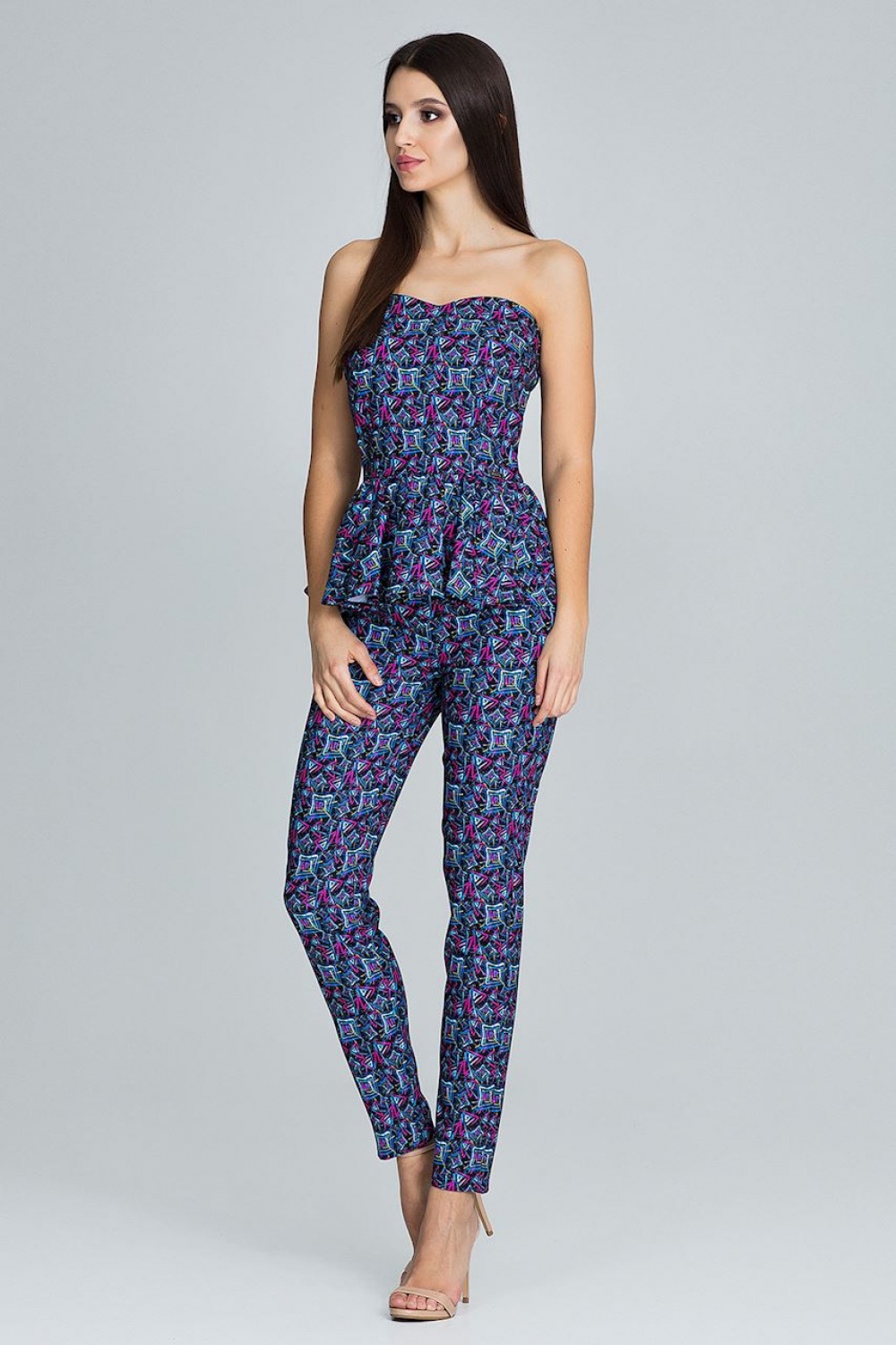 Een elegante set van een rechte broek met een korset afgewerkt met een volant, geeft onderscheidend vermogen en vrouwelijkheid. Een modieuze snit in een eenvoudige uitvoering past bij vele stijlen.
