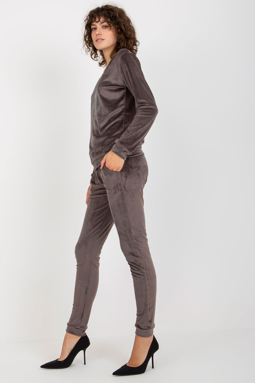 Velours set bestaande uit een blouse en een broek. Blouse met lange mouwen en een serape halslijn. Lange broek met tailleband en steekzakken.