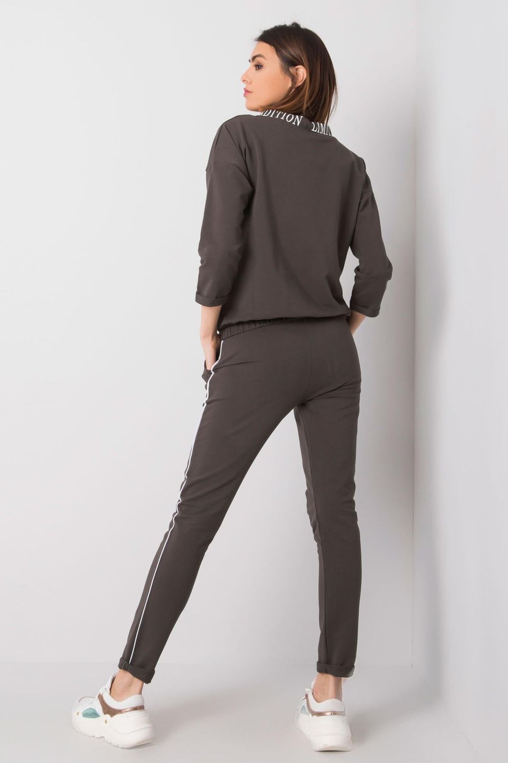 Dames trainingsset bestaande uit een sweatshirt en een broek. Blouse met 3/4-mouwen en kleine opstaande kraag. Lange broek met tailleband en steekzakken. Decoratieve inscriptie op voorzijde en kraag.