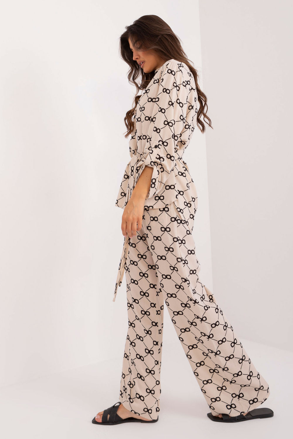 Ontdek de zomerse damesoutfit bestaande uit een elegante blouse en comfortabele broek. Deze set is de perfecte keuze voor dagelijkse uitstapjes, met een combinatie van comfort en stijl. De elegante blouse heeft knopen, wat het aan- en uittrekken vergemakkelijkt. Een extra tailleriem benadrukt de taille en voegt charme toe. De blouse heeft lange mouwen, waardoor hij geschikt is voor koelere dagen. De klassieke kraag geeft de blouse een formele uitstraling die perfect in balans is met de casual stijl. De broek is voorzien van een tailleband die zorgt voor een perfecte pasvorm. De rechte pijpen maken de broek veelzijdig en passend bij vele outfits. De hoge taille zorgt voor comfort en accentueert de taille. Praktische insteekzakken aan de zijkant voegen functionaliteit en comfort toe. De set is versierd met een originele print die de aandacht trekt en elke outfit een frisse uitstraling geeft.