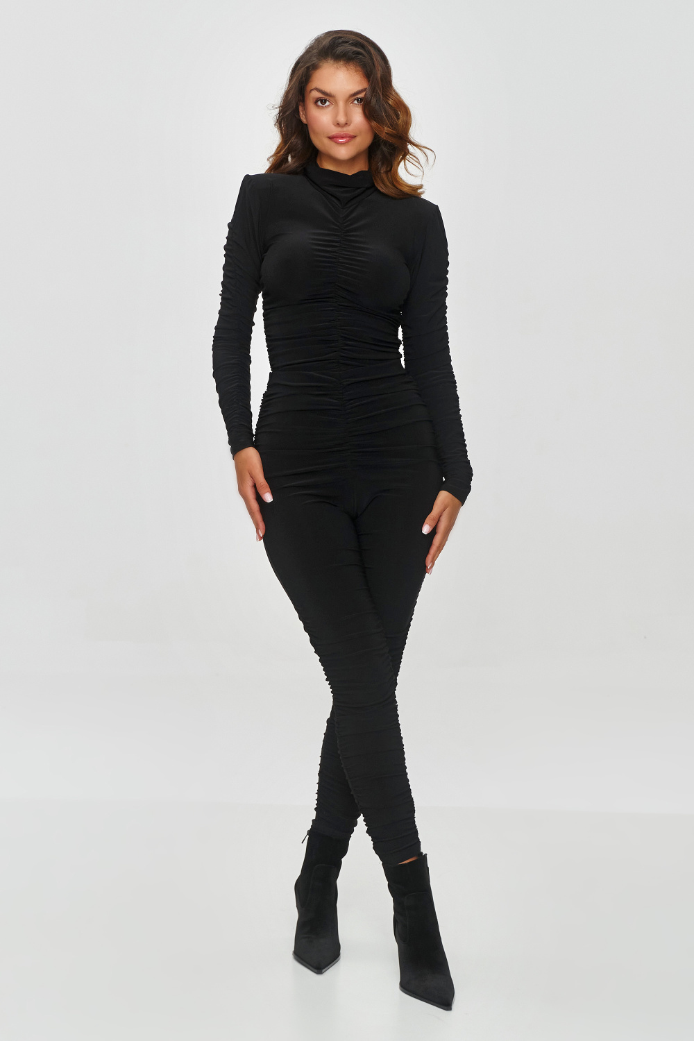 Een chique zwarte set met een elegante, getailleerde snit. De blouse heeft lange mouwen en een hoge halslijn voor een geraffineerde en gestroomlijnde look. De coupenaad langs de voor- en achterkant creëert een vouw die textuur toevoegt en het silhouet effectief vormgeeft. De broekspijpen lopen taps toe, wat de getailleerde look en moderne stijl benadrukt. De gladde stof met een lichte glans voegt glamour toe en past altijd en overal. De snit van dit model accentueert de taille en voegt sensualiteit toe aan de hele outfit. De nauwsluitende damesset brengt de diepste verborgen lagen van sexappeal en zelfvertrouwen naar boven. Perfect voor vrouwen met lef en echte fashionista’s.