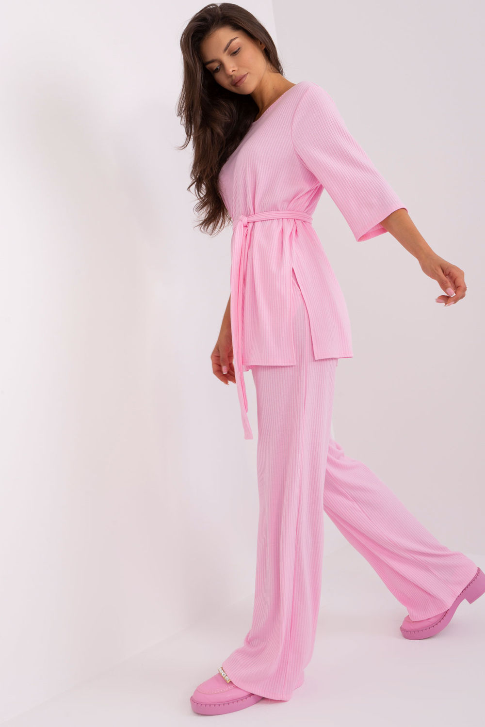 Stijlvol en comfortabel damespak van geribbeld materiaal, ideaal voor dagelijks gebruik. Gemaakt van hoogwaardig katoen met een vleugje elastaan, zorgt voor draagcomfort en een uitstekende pasvorm. De gladde textuur en subtiele ribbels geven het een moderne, minimalistische uitstraling. De blouse met 3/4 mouwen heeft een klassieke, universele snit die perfect past bij wijde broeken met een hoge taille. Een extra voordeel is de strikceintuur, waarmee de taille kan worden benadrukt en een elegante touch aan de outfit kan worden toegevoegd. De zijdelingse insteekzakken verhogen de functionaliteit en het comfort. Een geweldige keuze voor vrouwen die casual stijl, vrijheid en moderne details waarderen!