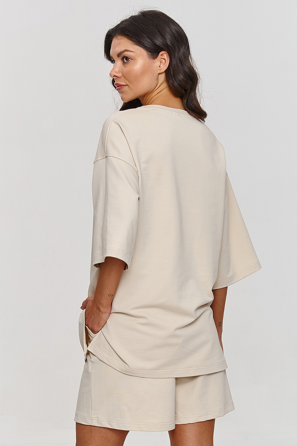 Deze comfortabele, trainingspak is de ideale oplossing voor vrouwen die comfort en tijdloosheid waarderen in hun dagelijkse outfits. De oversized pasvorm van het T-shirt garandeert volledige bewegingsvrijheid en een modieuze uitstraling. De korte mouwen en de klassieke ronde hals maken het de perfecte casual basis voor dagelijkse outfits. De shorts hebben een elastische tailleband voor een goede pasvorm en de zijzakken benadrukken hun functionaliteit. De losse pasvorm van de shorts en de wijde pijpen zorgen voor volledige bewegingsvrijheid, terwijl de kortere lengte ze perfect maakt voor warme dagen. Deze eenvoudige maar stijlvolle trainingspak combineert een minimalistisch design met comfort, waardoor het een geweldige optie is voor dagelijkse outfits. Een must-have voor ontspanning thuis, bijeenkomsten met vrienden of korte uitstapjes. Zijn veelzijdigheid maakt het ook geschikt voor verschillende fysieke activiteiten.