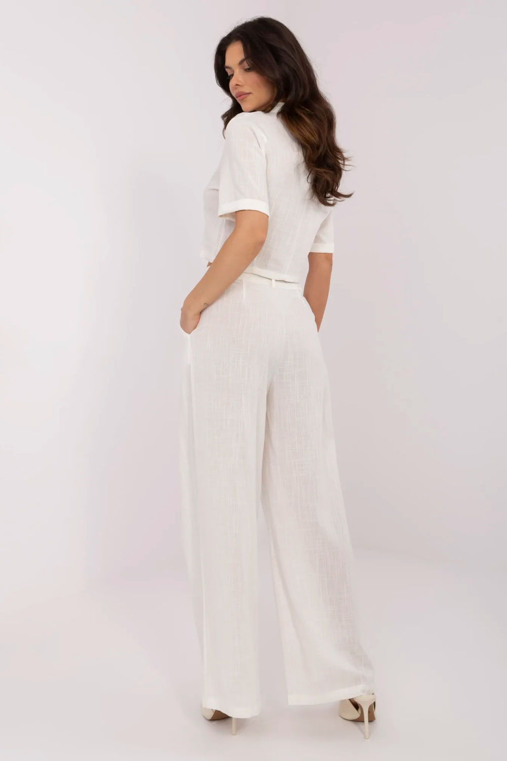Het damespak bestaande uit een korte blouse en broek is een ideaal voorstel voor dagelijkse casual stijlen. Gemaakt van luchtig linnen en viscose, garandeert het comfortabel dragen en bewegingsvrijheid, perfect voor warmere dagen. De blouse met een korte snit, klassieke kraag en korte mouwen, wordt gesloten met knopen, wat het een stijlvol en licht karakter geeft. Het gladde patroon maakt het pak veelzijdig en gemakkelijk te stylen. De lange, wijde broek met hoge taille benadrukt mooi de taille en verlengt optisch de benen. Het model heeft een knoop- en ritssluiting en de zijwaartse insteekzakken voegen functionaliteit toe. Dit is een set gemaakt voor vrouwen die comfort en een modieuze, minimalistische uitstraling waarderen, perfect voor dagelijks gebruik, naar de stad of voor zomerse ontmoetingen.