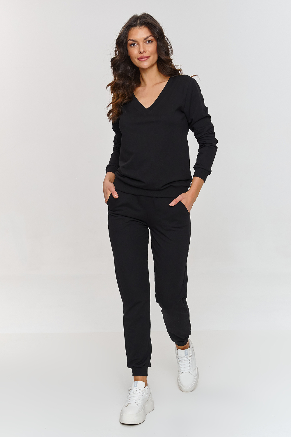 Dames trainingspak, gehouden in een eenvoudige esthetiek, is geschikt voor bijna elke gelegenheid. De set bestaat uit een trui die over het hoofd wordt aangetrokken en klassieke en comfortabele broek. De trui heeft geen capuchon, maar heeft een v-hals met een ribboord en afgewerkt met een omslag, wat het geheel een elegante uitstraling geeft. Ribbels zijn ook aanwezig op de mouwen en aan de onderkant van de trui, waardoor het perfect aansluit op het lichaam. De broek is gemaakt van hetzelfde materiaal, heeft steekzakken aan de zijkant en ribbels in de taille en aan de onderkant van de pijpen. Deze set is een uitstekende optie voor vrouwen die waarde hechten aan klassieke en tijdloze kleding in hun garderobe. Draag er designer sneakers of eenvoudige sneakers bij, in elke uitvoering zal de set er zeer stijlvol uitzien.