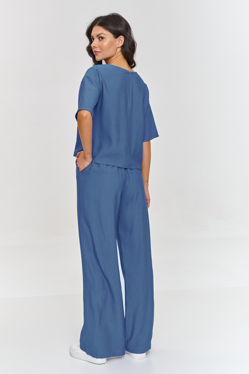 Deze elegante set is een ideaal voorstel voor de lente- en zomerdagen, wanneer je een modieuze uitstraling wilt combineren met hoogwaardige kwaliteit. De set heeft een losse blouse met een boxy pasvorm die perfect past bij elegante outfits. De korte mouwen en eenvoudige snit van de blouse maken het een uitstekende optie voor zowel formele als informele gelegenheden, waarbij elegantie wordt gecombineerd met comfort. De broek valt op door de wijde pijpen die de outfit een moderne en elegante uitstraling geven. De elastische tailleband zorgt voor draagcomfort en de lengte voegt klasse en stijl toe. Het model is gemaakt van zacht en licht materiaal dat lijkt op linnen. De eenvoudige maar verfijnde snit geeft de set een tijdloos karakter dat er stijlvol uitziet op elk figuur. De set is perfect voor zakelijke bijeenkomsten, elegante uitstapjes of stedentrips, wanneer je elegantie en comfort wilt combineren. Je kunt het combineren met hakken, elegante sandalen of witte sneakers.