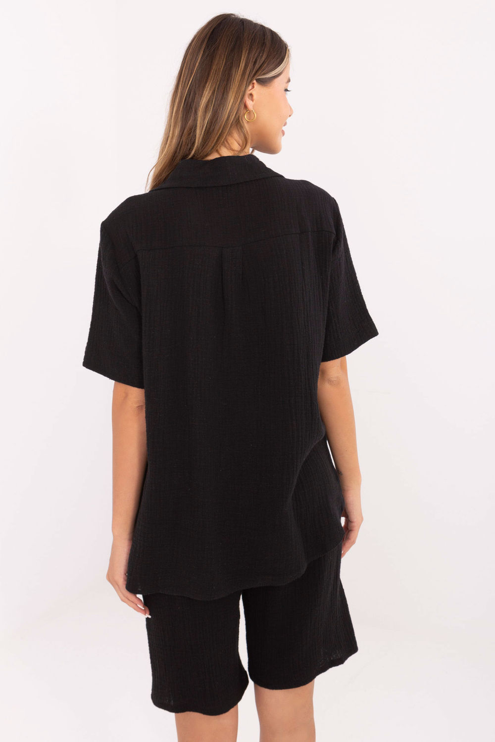 Lichte mousseline set bestaande uit een blouse en shorts is een ideale keuze voor warme, alledaagse dagen. Gemaakt van aangename, ademende katoen, zorgt voor maximaal draagcomfort en bewegingsvrijheid. Het gladde materiaal benadrukt de minimalistische, casual stijl van de set. De blouse met korte mouwen, kraag en knoopsluiting ziet er elegant en modern uit, en de extra riem om te strikken accentueert de taille en geeft het figuur een vrouwelijke vorm. De shorts met rechte pijpen en hoge taille zijn voorzien van praktische, zijdelingse insteekzakken. De set is perfect voor dagelijkse wandelingen, winkelen of bijeenkomsten met vrienden.