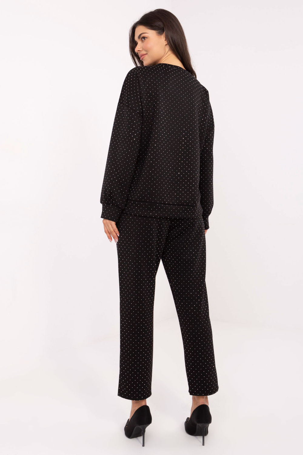 Stijlvol en comfortabel damespak is een voorstel voor vrouwen die elegantie waarderen in hun dagelijkse outfit. De set bestaat uit een trui en broek, en vormt een harmonieus geheel met een uitzonderlijk vrouwelijk karakter. Het model is gemaakt van een zachte mix van viscose en polyester, die perfect past bij de lichaamsvorm, comfort en een esthetische uitstraling biedt. De hele stof is versierd met subtiele jetapplicaties, waardoor de set een elegante, chique uitstraling heeft. De broek met hoge taille, rechte, lange pijpen en een strikceintuur in de taille benadrukken de taille en zorgen voor een perfecte pasvorm. De zijzakken voegen praktisch gebruik en ontspanning toe aan het dagelijks leven. Dit pak is geweldig voor veel gelegenheden, ideaal voor werk, vergaderingen en dagelijks gebruik. Het combineert het comfort van een trainingspak met de elegantie van een formele stijl en creëert een veelzijdige en moderne look.
