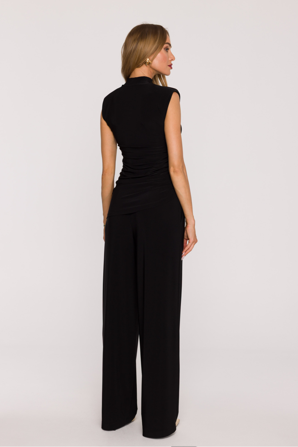 Moderne en elegante dames set gemaakt van gladde stof die zacht, elastisch en buitengewoon comfortabel is om te dragen. Deze combinatie van comfort met verfijnde stijl is ideaal voor zowel dagelijks gebruik als speciale gelegenheden. De mouwloze top heeft een aansluitende pasvorm, een coltrui en subtiele plooien die de taille benadrukken en lichtheid toevoegen. Het asymmetrische ontwerp aan de onderkant voegt een moderne touch toe en maakt de figuur optisch slanker. De broek met een losse pasvorm heeft wijde pijpen en plooien bij de taille, waardoor ze mooi op het lichaam vallen en volledige bewegingsvrijheid bieden. De zijzakken voegen functionaliteit toe, en de verborgen rits aan de achterkant zorgt voor een esthetische afwerking. De set heeft geen voering, waardoor hij licht en luchtig is. Het geheel is ontworpen en gemaakt in Polen met oog voor elk detail. Deze tweedelige set is een uitstekende keuze voor vrouwen die comfort, elegantie en moderne minimalisme waarderen.
