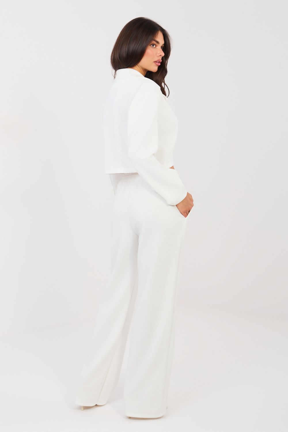 Stijlvolle trainingspakset: jasje plus broek, die elegantie combineert met dagelijks comfort. Gemaakt van een uitzonderlijk zacht aanvoelende stof van boterzacht, zacht en glad materiaal zorgt voor maximaal draagcomfort en een uitstekende pasvorm bij het silhouet. Het jasje met reverskraag en kraag, sluitend met knopen, geeft het geheel een moderne, casual uitstraling. De lange mouw versierd met knopen vormt een stijlvol detail dat de verfijnde afwerking benadrukt. De broek met hoge taille, lange, rechte pijpen en een strikceintuur garanderen comfort en bewegingsvrijheid. Het model is voorzien van zijzakken die de functionaliteit van de set vergroten. Het gladde patroon en zorgvuldig gekozen mix van polyester, viscose en elastaan maken de set perfect geschikt voor zowel dagelijkse styling als voor werk in een trendy, comfortabele uitvoering. Dit is een ideale optie voor vrouwen die stijl, comfort en veelzijdigheid waarderen in één set.