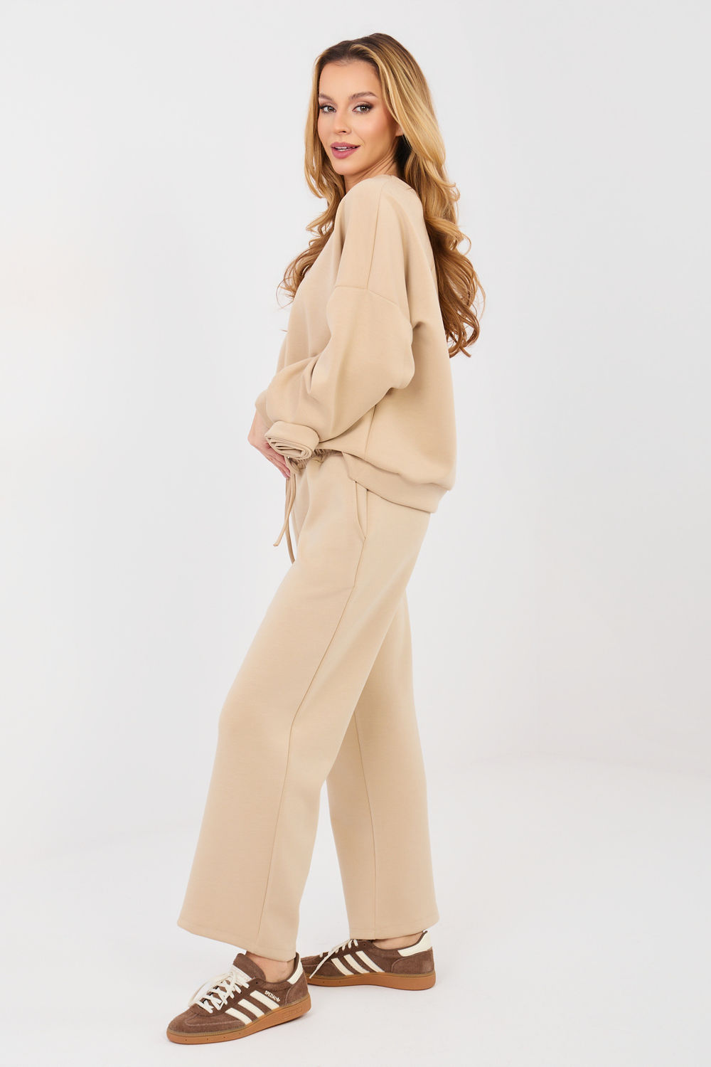 Stijlvolle damesset bestaande uit een trui en broek, ideaal voor dagelijkse casual styling. Gemaakt van zachte en aangename viscose met een vleugje elastaan, die comfort en bewegingsvrijheid gedurende de hele dag biedt. De langere trui heeft een ronde hals en lange mouwen, versierd met een subtiele stoffen roos bij de pols, wat het geheel een vrouwelijke en originele uitstraling geeft. De broek met hoge taille en rechte pijpen garandeert comfort en een tijdloze uitstraling. In de taille is een elastische band en trekkoord toegepast, waardoor een perfecte pasvorm mogelijk is. De zijzakken voegen functionaliteit toe aan de set. Het gladde patroon maakt de set veelzijdig en gemakkelijk te stylen, perfect voor zowel een wandeling als dagelijks gebruik. Dit is een voorstel voor vrouwen die comfort, stijl en subtiele details waarderen.