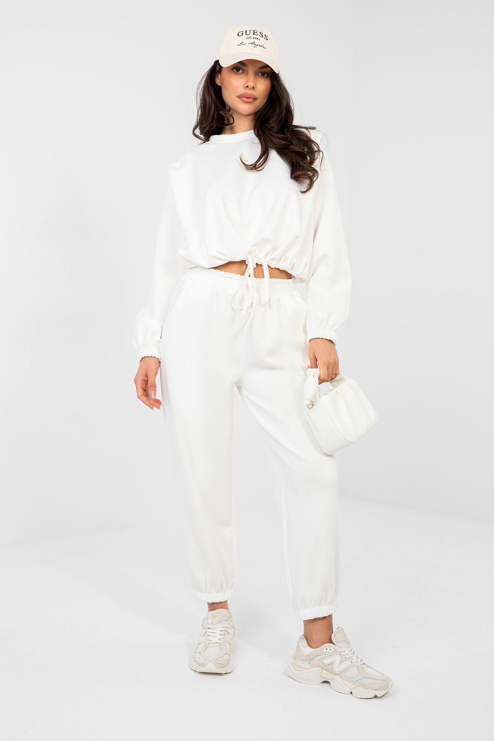 Een complete dames trainingspak bestaande uit een trui en broek is een uitstekend voorstel voor vrouwen die comfort en een casual stijl waarderen in het dagelijks leven. Het gladde materiaal benadrukt het minimalistische karakter van de set en maakt het compleet extreem veelzijdig. Gemaakt van een hoogwaardige mix van viscose en elastaan, betovert het met een boterzachte stof die zacht, delicaat en buitengewoon aangenaam aanvoelt. De stof valt prachtig op het silhouet, is elastisch en zorgt voor maximaal draagcomfort gedurende de hele dag. De trui met lange mouwen en een klassieke, ronde hals heeft een strik aan de onderkant, waardoor aanpassing en subtiele nadruk op de taille mogelijk is. De broek met hoge taille en elastische tailleband garanderen een perfecte pasvorm. Lange pijpen met manchetten geven een sportief karakter, terwijl de steekzakken aan de zijkant de functionaliteit vergroten. Dit is de ideale keuze voor dagelijkse uitstapjes, wandelingen of ontspanning in huiselijke sfeer. Een stijlvol, comfortabel en buitengewoon aangenaam te dragen set, die snel een favoriet kledingstuk zal worden.