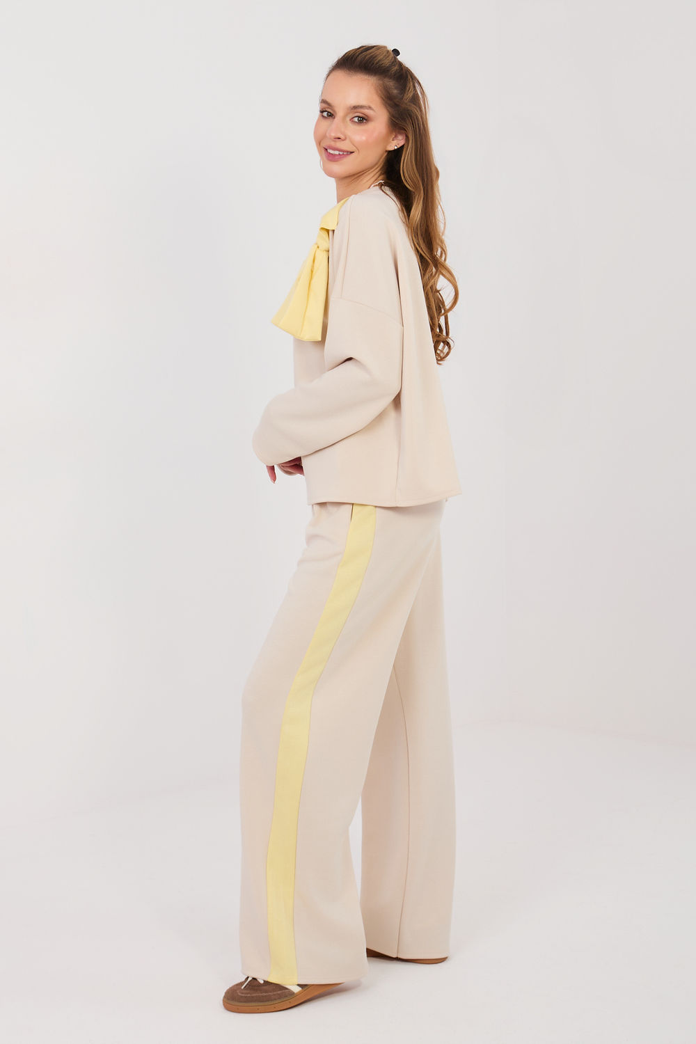 Stijlvolle dames trainingspak in een casual uitvoering is een ideale keuze voor dagelijks gebruik. De combinatie van comfort met trendy details maakt dat de set perfect is voor dagelijkse activiteiten, wandelingen of informele ontmoetingen. De set bestaat uit een trui met lange mouwen en een klassieke, ronde hals, en lange broek met wijde pijpen. Het gladde patroon benadrukt het universele karakter van de set, waardoor het gemakkelijk te combineren is met verschillende accessoires. De trui is versierd met een opvallende contrasterende strik aan de voorkant, die een vrouwelijk en subtiel elegant accent toevoegt aan het geheel. De broek met hoge taille modelleert mooi de taille, en de elastische tailleband zorgt voor een comfortabele pasvorm. Bovendien zijn er praktische steekzakken aan de zijkanten en strepen langs de pijpen, die een sportief karakter geven en de benen optisch slanker laten lijken. De set is gemaakt van een aangename mix van polyester, viscose en elastaan, waardoor de stof zacht, elastisch en kreukbestendig is, wat zorgt voor comfortabel dragen gedurende de hele dag. Het is een comfortabele en vrouwelijke set die sportieve vrijheid combineert met trendy details.