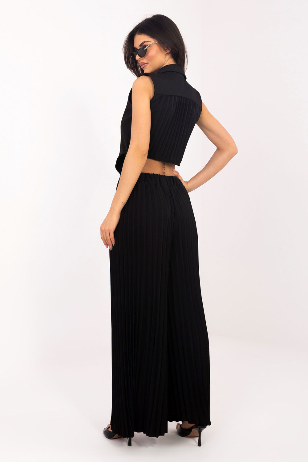 Damespak bestaande uit een vest en broek is een elegante en veelzijdige optie die zowel geschikt is voor dagelijkse outfits, werk, als voor formele gelegenheden of feestjes. De combinatie van een klassieke snit met een moderne pasvorm creëert een comfortabele en tegelijkertijd stijlvolle set. De broek met lange, wijde pijpen is gemaakt van een mix van polyester, viscose en elastaan, wat zorgt voor draagcomfort, lichtheid en subtiele elasticiteit. Het plooien over de hele lengte en de elastische tailleband garanderen een comfortabele pasvorm en bewegingsvrijheid. Het mouwloze vest met dubbele rij knopen is afgewerkt met een kraag en het subtiele plooien op de rug voegt elegantie en een origineel karakter toe. Het effen patroon van de hele set geeft het een universele en tijdloze stijl. Het is de ideale set voor vrouwen die elegantie, comfort en modern design waarderen, geschikt voor vele gelegenheden van werk, sociale bijeenkomsten tot meer formele gelegenheden.