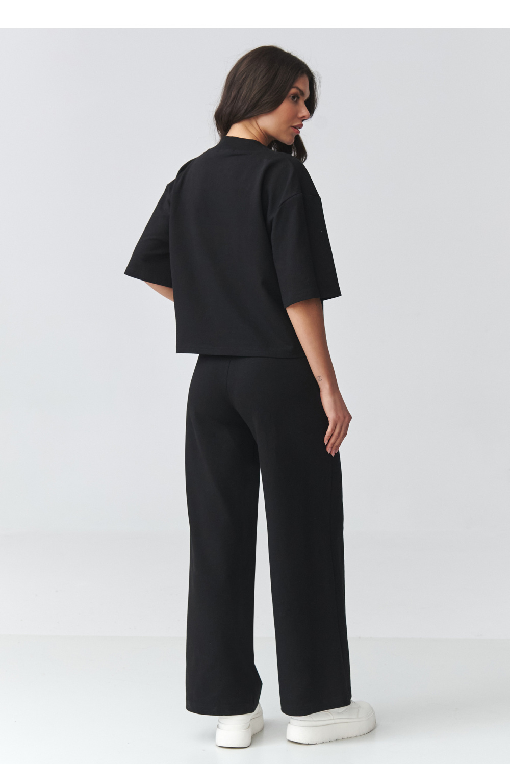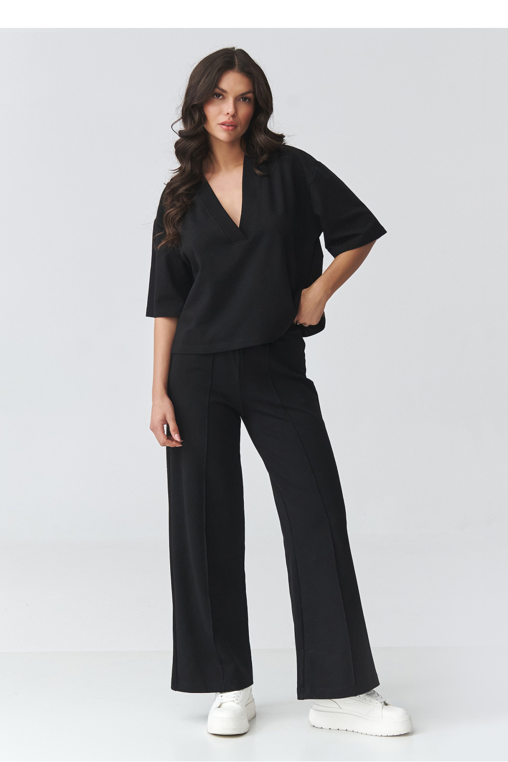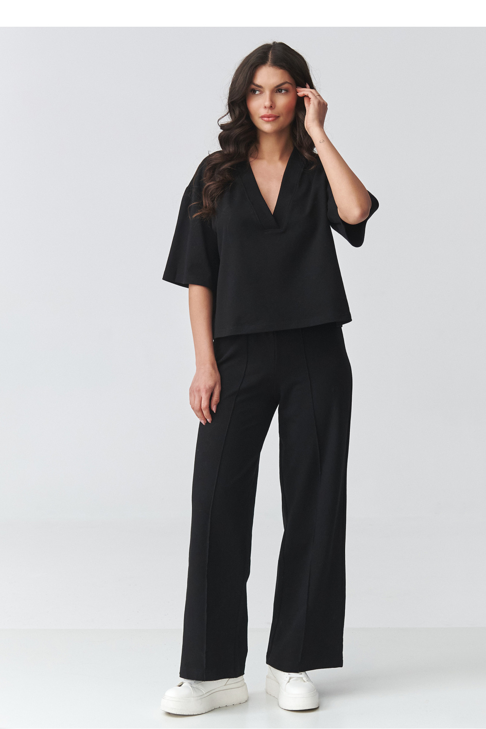 Stijlvolle dames set met wijde broek is de perfecte combinatie van comfort en moderne elegantie. De set bestaat uit een losse blouse met een V-hals en wijde broekspijpen die het silhouet prachtig verlengen en de outfit lichtheid geven. Deze elegante dames set is geschikt voor zowel dagelijks gebruik als voor meer formele gelegenheden. Het is een uitstekende keuze voor werk, een afspraak, een wandeling of een uitje. Het minimalistische ontwerp maakt het mogelijk om verschillende outfits te creëren, van sportief met sneakers tot chique met elegant schoeisel. De blouse met een losse pasvorm zorgt voor comfortabel dragen en accentueert subtiel de halslijn, terwijl de wijde broekspijpen comfort en een modieuze, tijdloze uitstraling garanderen. Het geheel vormt een samenhangende casual dames set die ontspanning met klasse combineert.