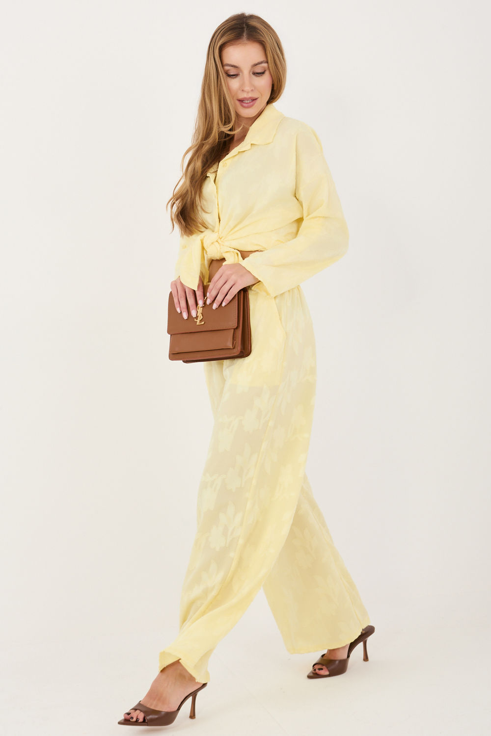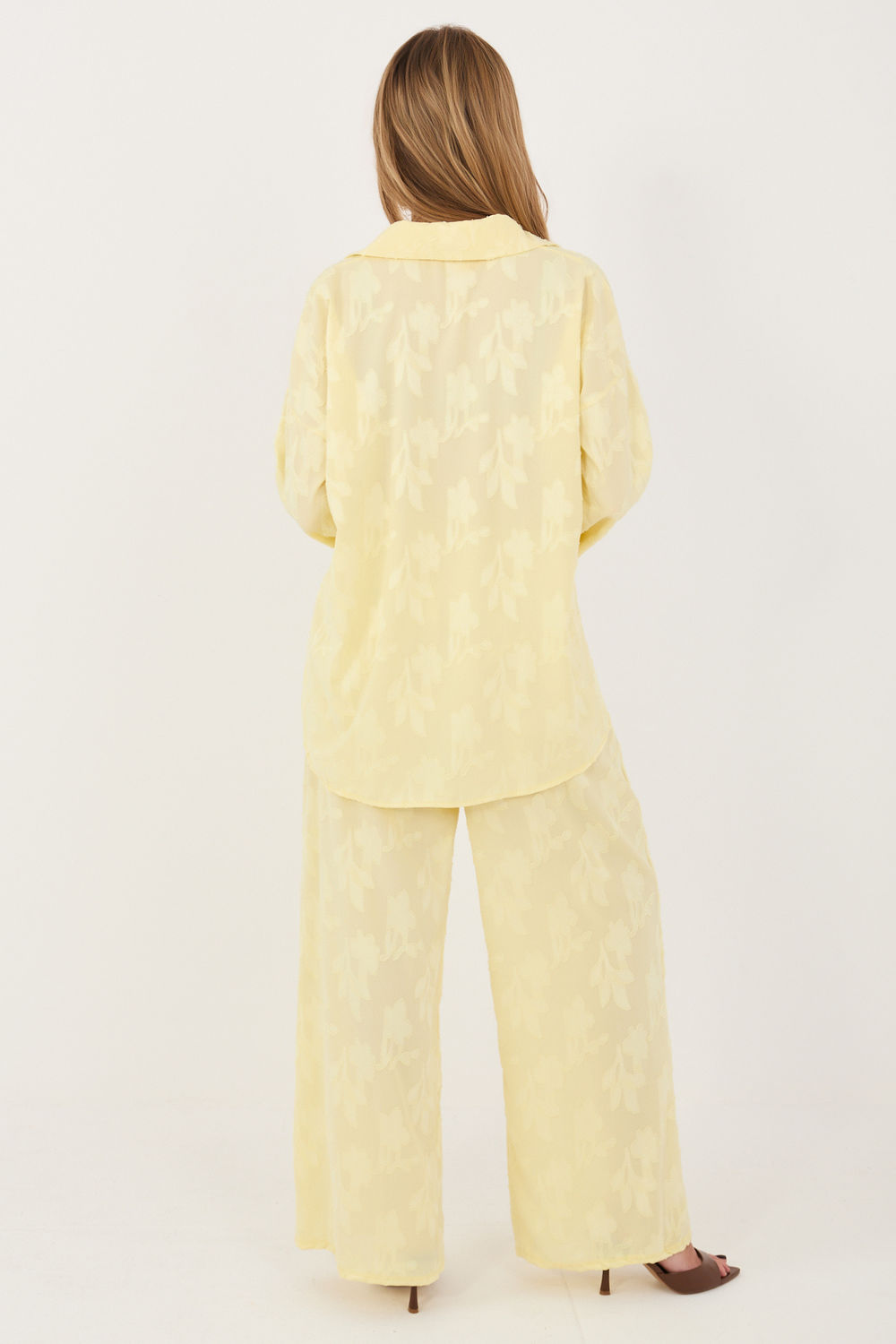 De dames set bestaande uit een shirt en broek is een stijlvol en comfortabel voorstel voor elke dag. Het onderscheidt zich door de gevarieerde textuur van het materiaal, die het geheel een modern en origineel karakter geeft. Het shirt met lange mouwen, klassieke kraag en knoopsluiting ziet er elegant uit, maar tegelijkertijd casual, waardoor het zowel in casual als meer formele outfits goed tot zijn recht komt. De broek met lange pijpen is voorzien van een elastische tailleband met ingenaaid elastiek, wat zorgt voor een comfortabele pasvorm en draagcomfort gedurende de hele dag. Daarnaast hebben ze praktische, zijdelingse insteekzakken. De set gemaakt van een zachte en aangenaam aanvoelende mix van viscose en elastaan garandeert lichtheid, flexibiliteit en bewegingsvrijheid. Het is de ideale keuze voor vrouwen die comfort waarderen gecombineerd met een modieuze uitstraling.